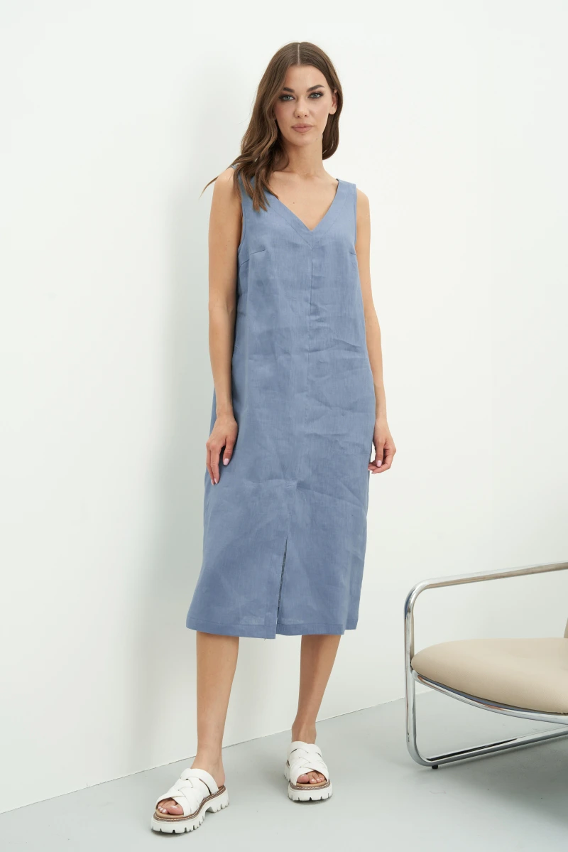 Лёгкое и безумно красивое платье! В жаркий и солнечный день оно помогает не только красиво выглядеть, но и чувствовать себя максимально комфортно. Оно отлично сочетает в себе простоту и стиль, что максимально нравится модницам.Свободный упрямлённый силуэт, без рукава, изящный -образный вырез, нагрудная вытачка, карманы в боковых швах с настрочной фигурной мешковиной. По центру переда кокетливый разрез. Спинка с центральным швом.Длина платья около 110 см.