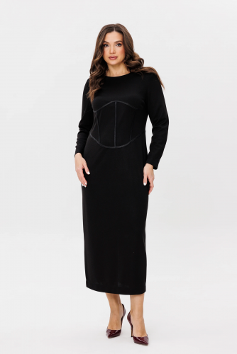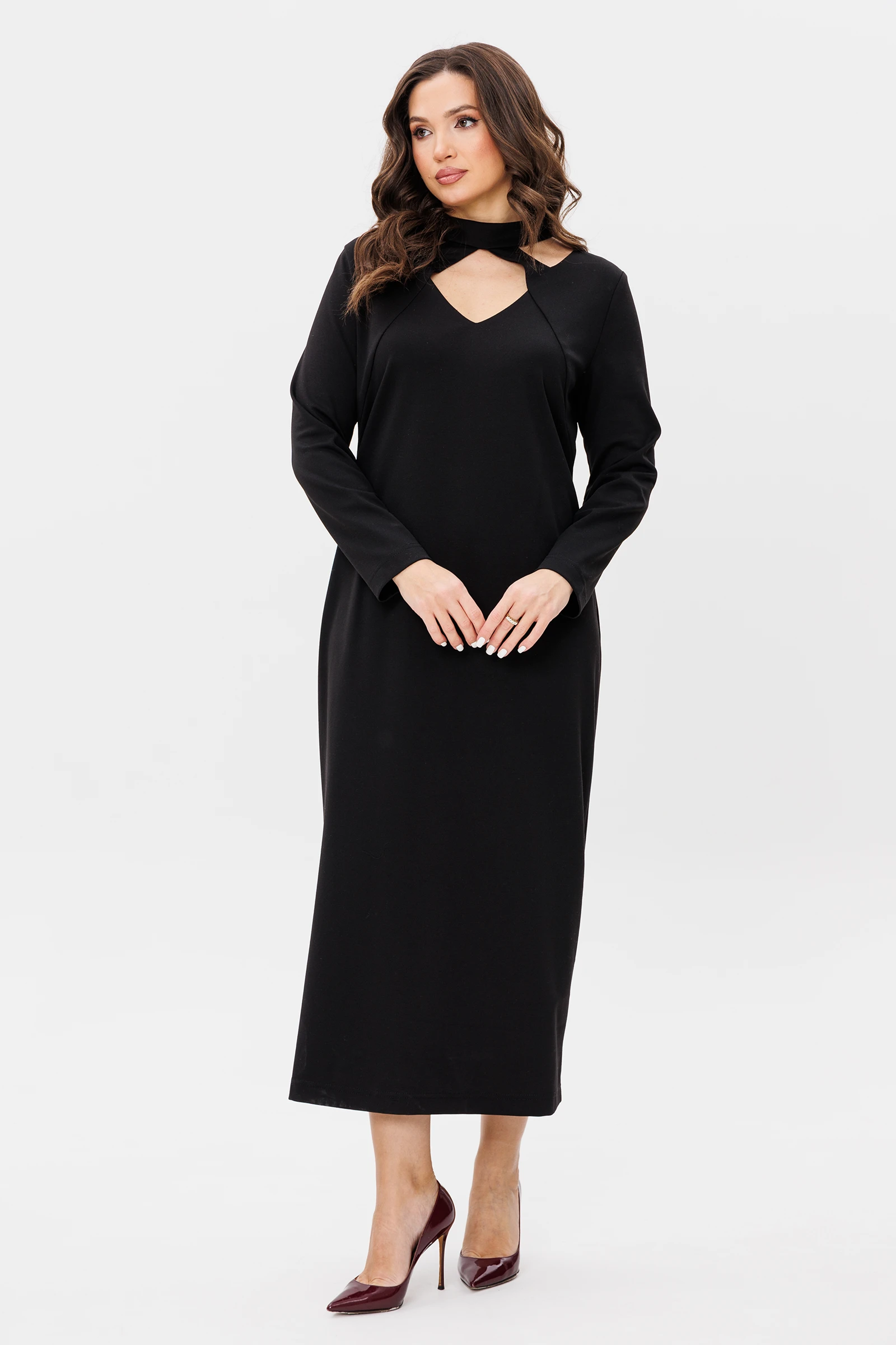 Таинственность великолепного чёрного платья не останется не замеченной. Она элегантно и лаконично, однако оригинальное исполнение выреза горловины со сложным геометрическим решением, делает образ очень эффектным. Полуприлегающий силуэт, втачной покрой. Полочка с рельефом, переходящим в вырез горловины. Спинка с центральным швом, разрезом и молнией, цельнокроённой стойкой и талиевой вытачкой.Длина платья около 132 см.Длина рукава около 60 см.