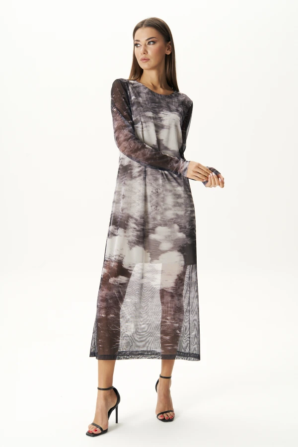 Платье из сетки сегодня стало одним из самых популярных в мире моды.Выполнено из мелкой матовой сетки с оригинальным дизайнерским принтом-такое платье станет отличной альтернативой вязанным и кружевным нарядам - лёгкое, струящееся, соблазнительное.Наше платье простое по покрою-может быть вполне праздничным, если подобрать к нему аксессуары и обувь.Отлично вписывается оно и в ежедневный гардероб, позволяя собирать новые интересные и стильные образы.Платье прямого силуэта с втачными длинными узкими рукавами.Вырез горловины красивой овальной форм.Перед и спинка платья-на мягкой трикотажной подкладке телесного тона.Длина изделия около -128 см.Длина рукава около- 63 см.