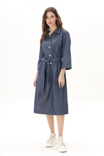 Платье полуприлегающего силуэта, втачного покроя, с рубашечным воротником на цельнокроеной стойке. Полочка с вертикальными рельефами и частичной застежкой на петли и пуговицы. По боковым швам - карман с листочкой. Спинка с отрезной кокеткой, срезным швом и вертикальным частичным рельефом. Модель дополнена съемным поясом. Все конструктивные элементы подчёркнуты отделочными контрастными строчками.Длина платья 107 см. Длина рукава 48 см.