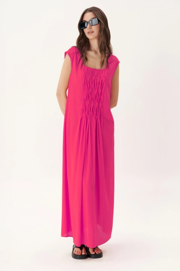 Красивое, воздушное платье… Это то, что находится в нашем гардеробе не только для настроения, но и для самоощущения. Масштабируя женственность, оно дарит уверенность в себе, лёгкую походку, грацию…Свободный А-силуэт, покрой с заниженной линией плеча, длина макси. Полочка с эффектным вырезом и авторскими сложными буфами. Спинка - со средним швом.Длина платья около 130 см.