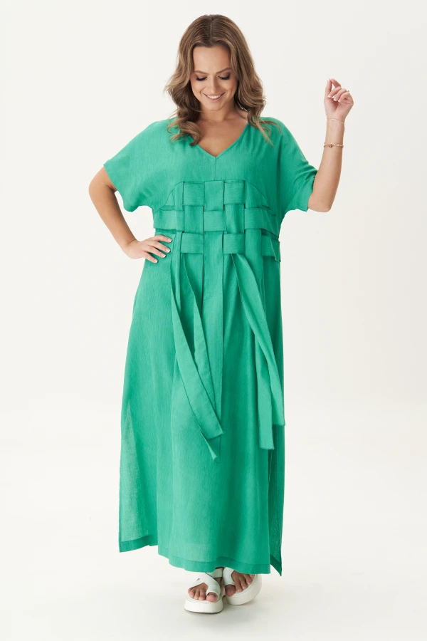 Вжух… И платье взлетело. Летом хочется уйти от официоза!Свободное, многослойное, из натуральной вискозы с авторской декорацией из плетёных полос - это не платье … это мечта!Свободный А-силуэт, цельнокроеный рукав, -образный вырез.Полочка с фигурной кокеткой и плетением из лент. Спинка с фигурной кокеткой, средним швом и повторяющим полочку плетением. По боковым швам - разрезы.Длина платья около 132 см. Длина рукава с плечом около 36 см.