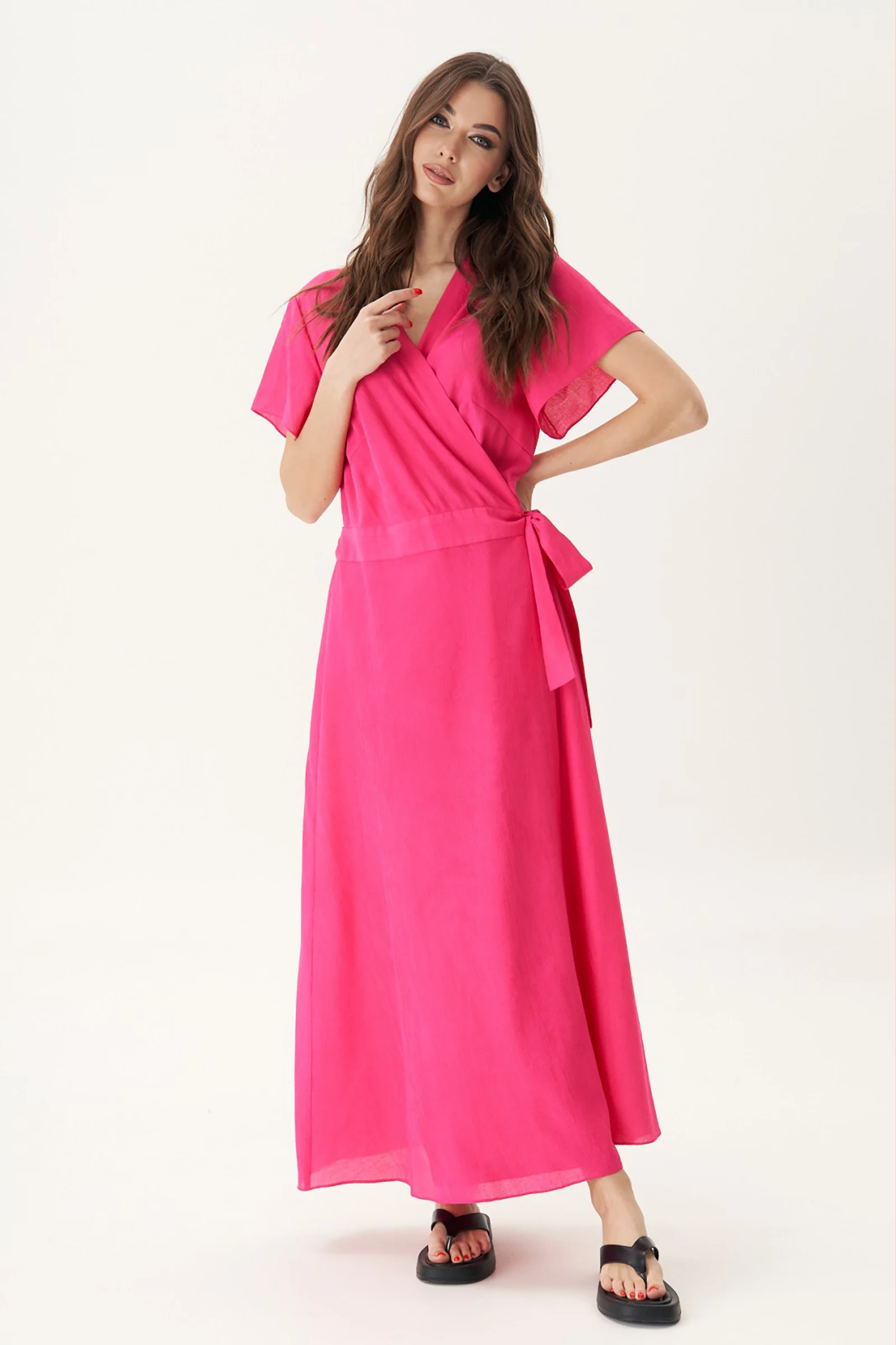 Состав:вискоза 87%, нейлон 13%.Платье с запахом. Оно крайне удобно! Его идеальная посадка зависит только от того, как сильно вы хотите подчеркнуть линию талии поясом.Воздушная, вискозная ткань, эффектный минимализм и чистота линий!Свободный А-силуэт, рукав - крылышки. Полочка с отрезным лифом, с нагрудной вытачкой, втачным поясом и конической нижней частью. Спинка со средним швом.Длина платья около 132 см. розовый