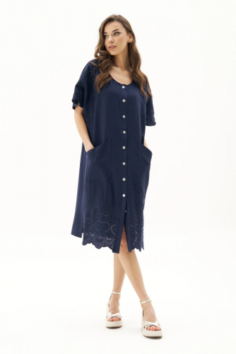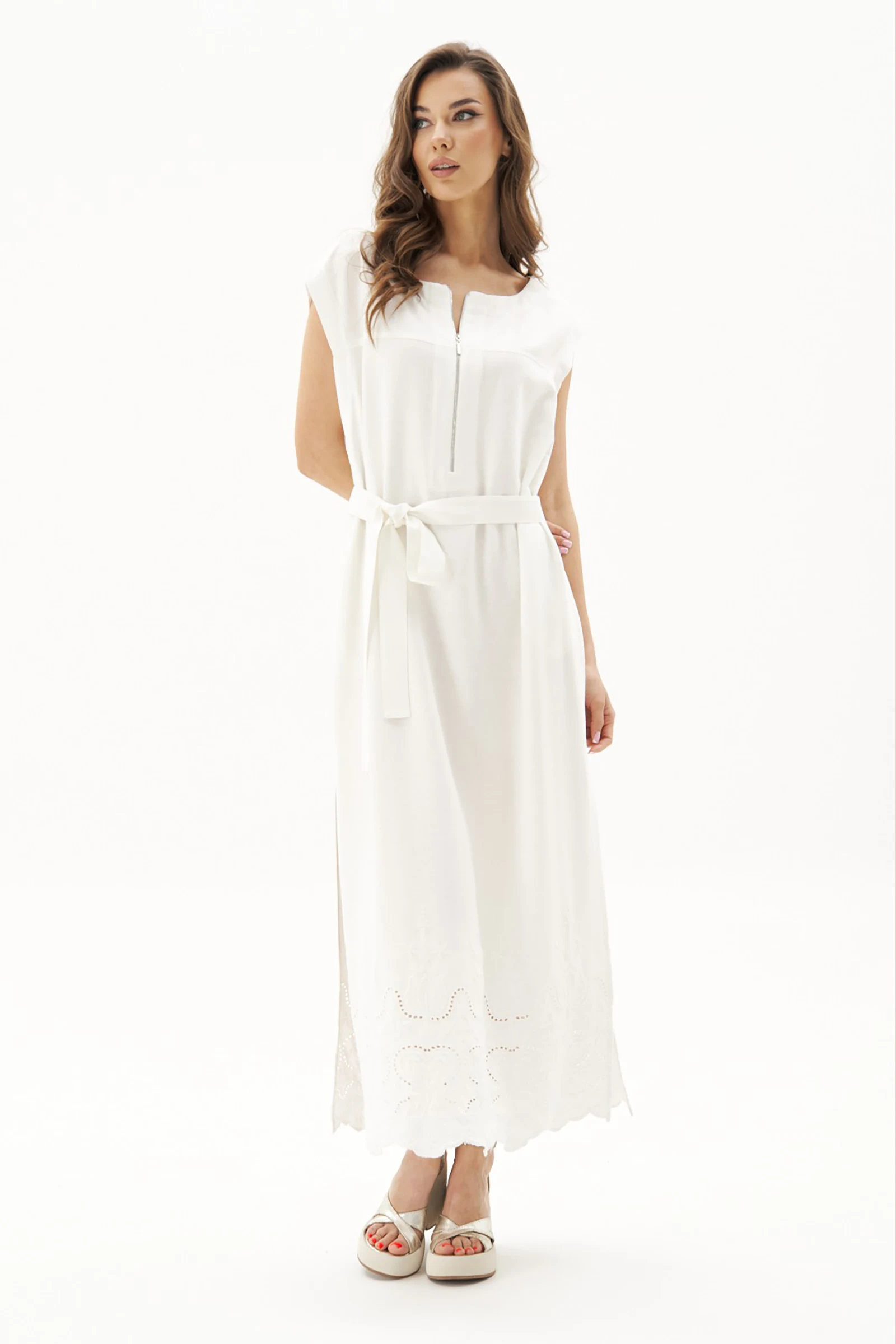 Состав: 74% лен, 26% вискоза.Женское платье из однотонной ткани для повседневной носки. Платье прямого силуэта, со спущенной линией плеча, и проймой, переходящей в подрез треугольной формы. Перед лифа состоит из двух частей: горизонтальной кокетки и нижней части. Застёжка на тесьму-молнию в центральном шве переда. Спинка платья состоит из двух частей: горизонтальной кокетки и нижней части, в среднем шве спинки обработана шлица. Модель дополнена съемным поясом. белый