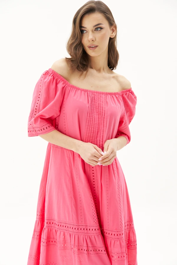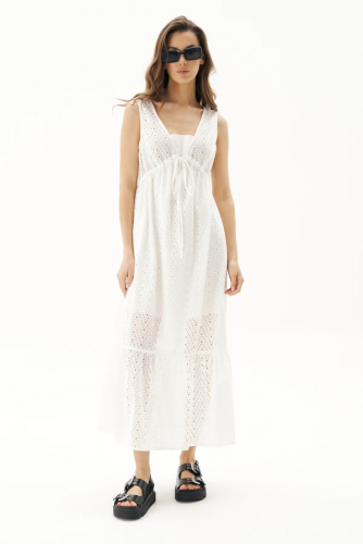 Невероятное платье из хлопкового шитья длинны миди. Не слишком длинное и не слишком короткое, не слишком игривое и не слишком строгое, не слишком официальное и не слишком легкомысленное, оно позволяет умело внедрить его в образ с любым характером.Свободный А-силуэт, покрой- реглан, вырез горловина - каре. Полочка с отрезным лифом и двумя воланами со сборкой.По центру лифа полочки - складки-защипы. Спинка с отрезной верхней частью и двумя воланами со сборкой. По вырезу горловины и верх рукавов - эластичная тесьма.Длина платья около 105 см.Длина рукава с плечом около 30 см.