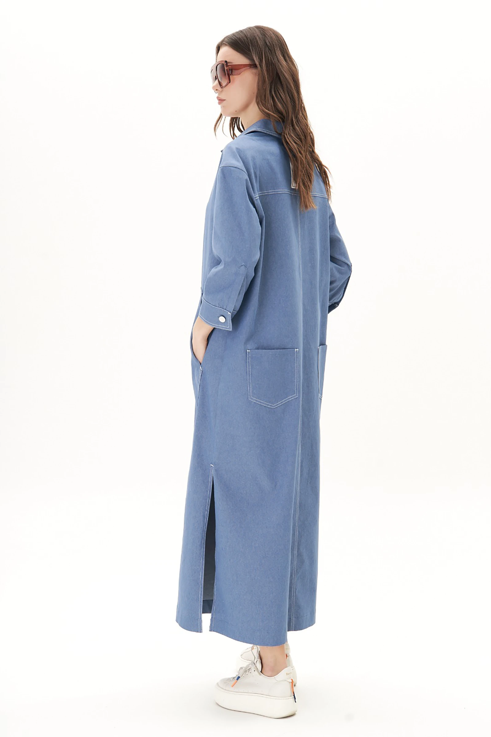 Платье свободного А-силуэта, рубашечного покроя с заниженной линией плеча, рубашечным воротником и рукавом. Полочка с частичной застежкой и накладными фигурными карманами. Спинка с отрезной кокеткой, средним швом и накладными задними карманами. Рукав с локтевой планкой и притачной манжетой с петлей и пуговицей. По боковым швам - разрезы. Все конструктивные элементы платья подчёркнуты контрастными отделочными строчками.