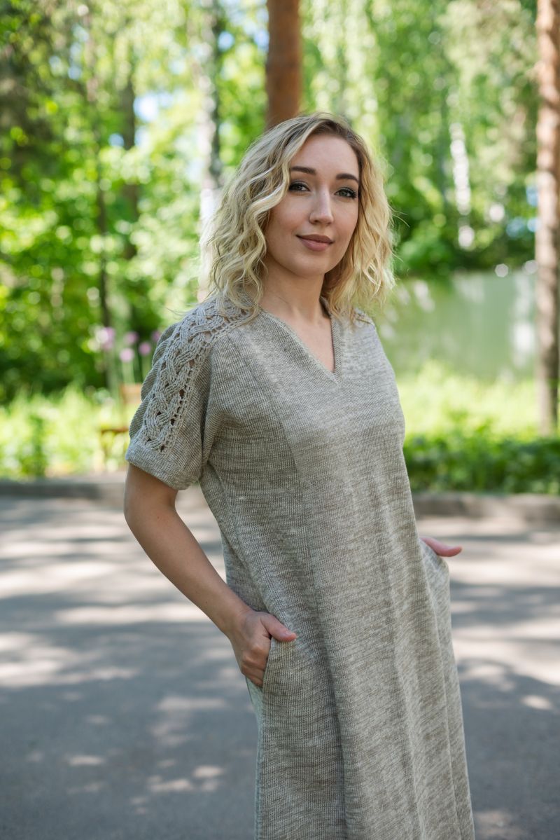 Описание: Платье с рельефами, линия плеча спущена, вставка крючок, по бокам карманы, трикотаж
