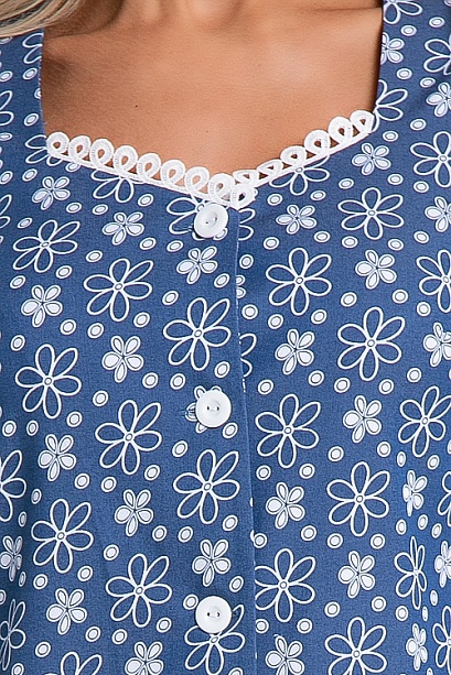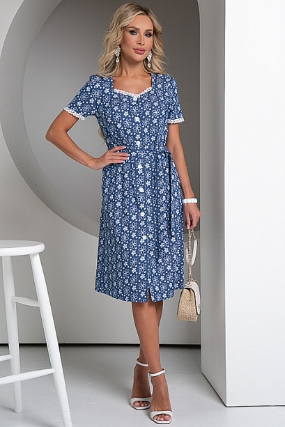 Платье из облегченной джинсовой ткани тенсель с центральной застежкой на пуговицы до низа,по горловине и рукавам украшено плетеным кружевом.Пояс из основной ткани в комплекте.