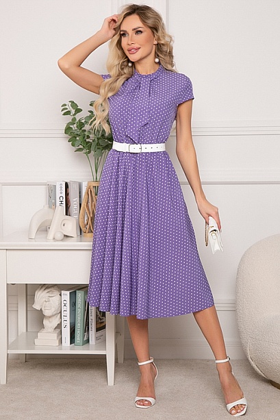 Платье из текстильного полотна,отрезное по линии талии,присобрано на эластичную резину, с летящей расклешенной юбкой.Горловина стойка с застежкой на пуговицу сзади.В комплекте съемный галстук-шарф(можно завязать на бант)Ремень в комплект не входит.