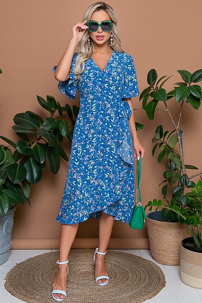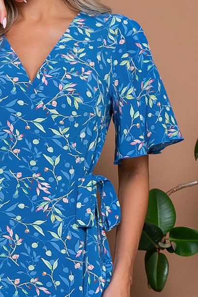 Платье из текстильного полотна с полным-функциональным запахом.По бортам вшиты пояски,которые завязываются и позволяют регулировать ширину платья по талии.Мягкий рукав-крыло и волан по юбке придают платью необыкновенную женственность.