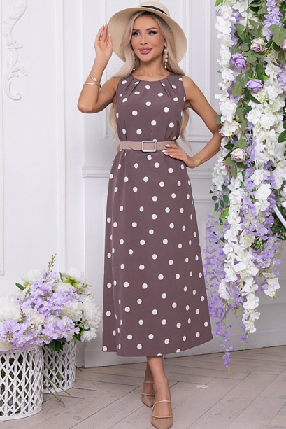 Платье из текстильного полотна А-образного силуэта.Горловина круглая с застежкой  среднем шве спинки на петлю и пуговицу.Перед платья с мягкими защипами от горловины.Платье можно носить в двух вариантах, как трапецию,а можно приталить ремнем.Ремень в комплект не входит.