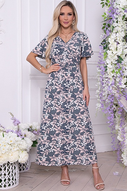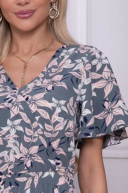 Платье из текстильного полотна,отрезное по линии талии с расклешенной юбкой и разрезами по бокам.Лиф с имитацией запаха.По талии платье собрано на широкую резину.