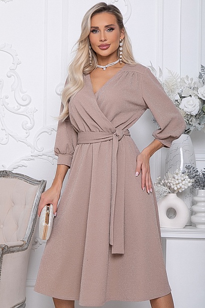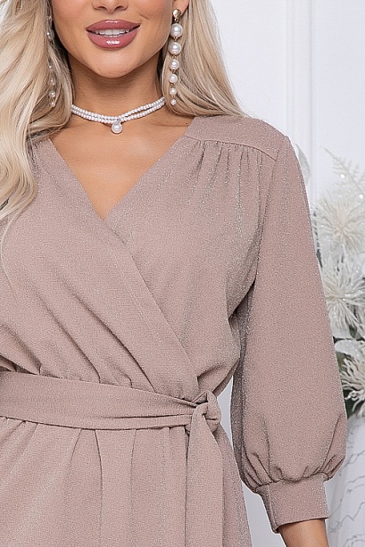 Платье из трикотажного полотна с люрексом,отрезное по линии талии с эластичной резиной,юбка расклешенная летящая.По лифу эффектный запах.Пояс из основной ткани в комплекте