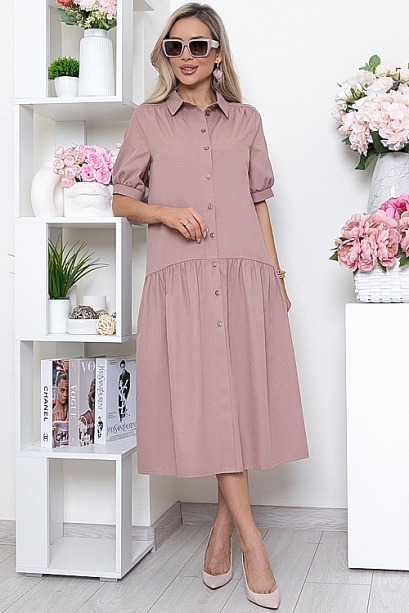 Платье миди свободного силуэта из текстильного полотна с хлопком с центральной застежкой на петли и пуговицы.