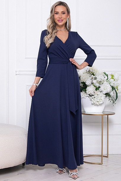Нарядное элегантное платье из трикотажного полотна,отрезное по лини талии с расклешенной юбкой.Лиф платья с полным запахом,задрапированным по линии талии.Пояс из  основной ткани в комплекте.