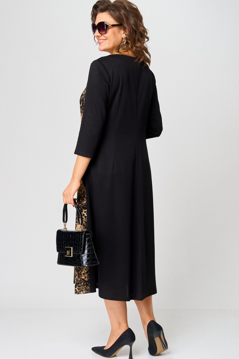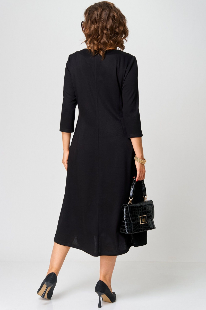 Платье женсоке повседневное полуприлегающего силуэта расширенное к низу, выполнено из трикотажного полотна двух дизайнов. Вырез горловины круглый на обтачке. рукав втачно 3/4. Спинка платья выполнена из однотона, полочка с отделочными вставками из цветного трикотажа. В одном бокоовм шве обраборан разрез. Декором платья служат вставки из отделочного трикотажа.