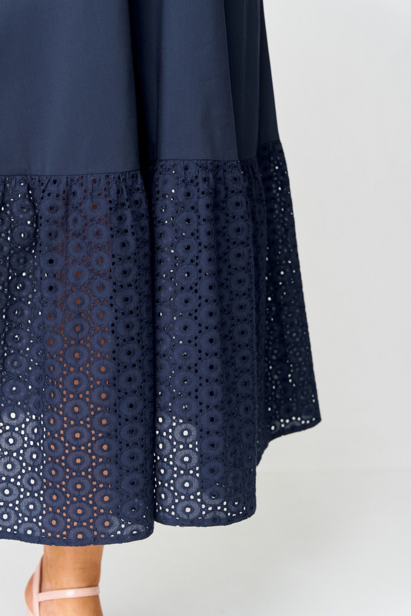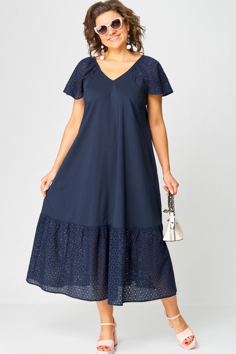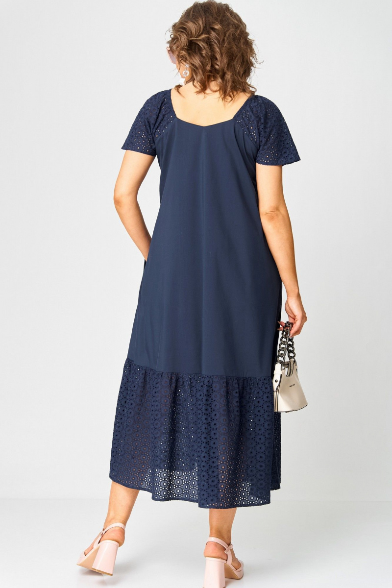 Платье женское нарядно-повседневное выполнено из однотонного хлопка в сочетании с отделочной тканью (шитье). Вырез горловины V-образный. Рукав втачной "реглан" по спинке и полочке собран на резинку. По низу платья притачной волан из отделочной ткани(шитье). В боковых швах обработаны карманы. Декорм платья служат детали из отделочной ткани.
