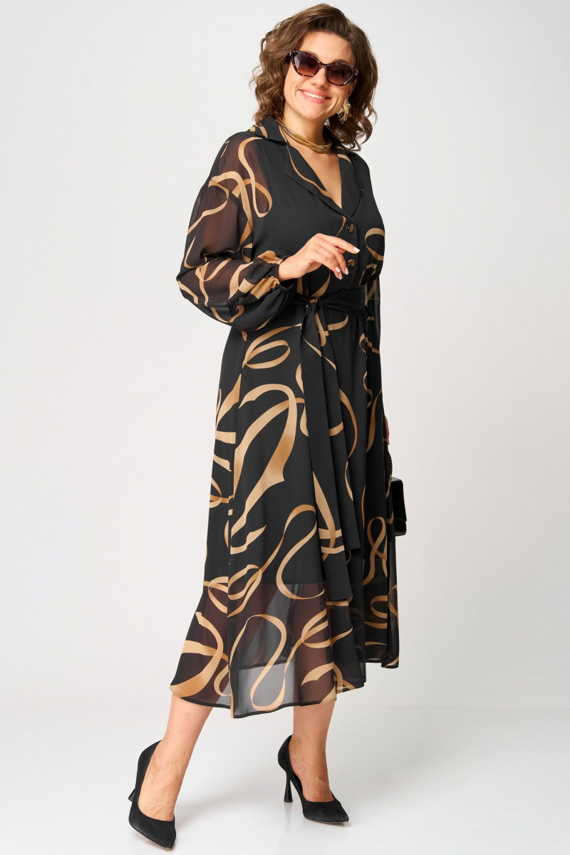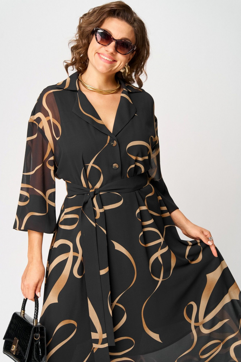 Платье женское нарядно-повседневное полуприлегающего силуэта до талии расширенное к низу. Плье отрезное по талии. Выполнено из креп-шифона. Вырез горловины отложной воротник с подбортами, до талии застежка на обметанные петли и пуговицы. Рукав втачной по низу собран на резинку. от талии юбка платья на трикотажной подкладке. Декором платья служит съемный пояс и принт самой ткани.