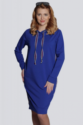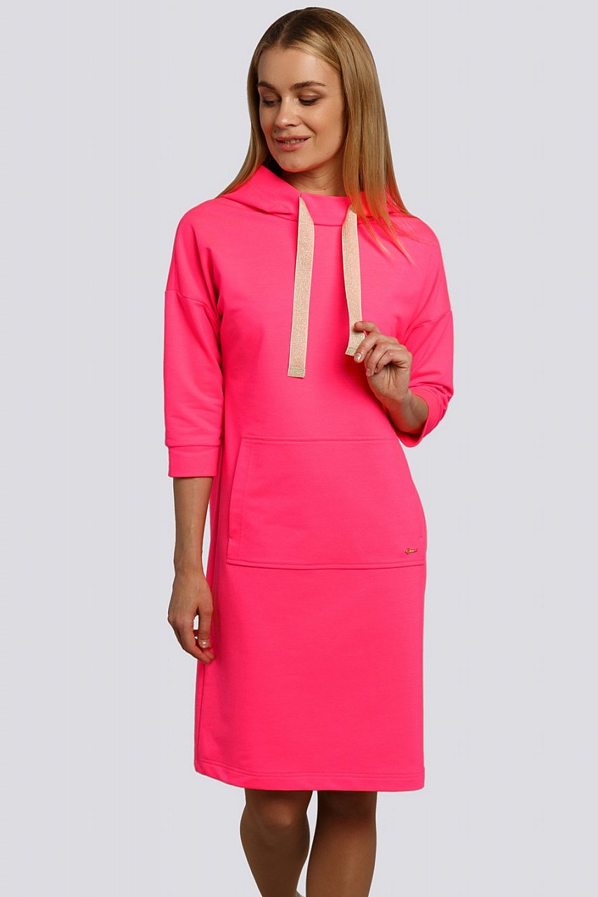 Отличное спортивное платье, свободный прямой крой. А цвет не оставляет незамеченным. Нюанс - капюшон оттягивает платье назад, не очень удобно, но терпимо.