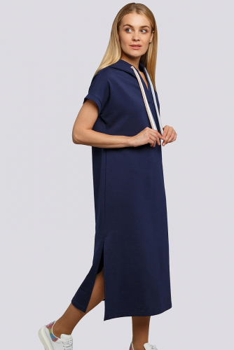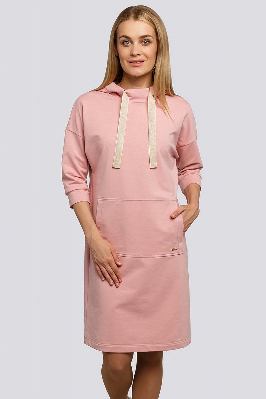 Платье из трикотажного полотна представляет собой очень удобную, комфортную в носке модель. Фасон достаточно лаконичен, прямого силуэта. Платье дополняют элементы спортивного стиля - капюшон с декоративной тесьмой, накладной карман. Модель абсолютно универсальна, не обтягивает фигуру, с рукавом средней длины с манжетой. Широкая цветовая гамма делает модель всесезонной. Состав трикотажа: 75% хлопок, 20% полиэстер, 5% спандекс.