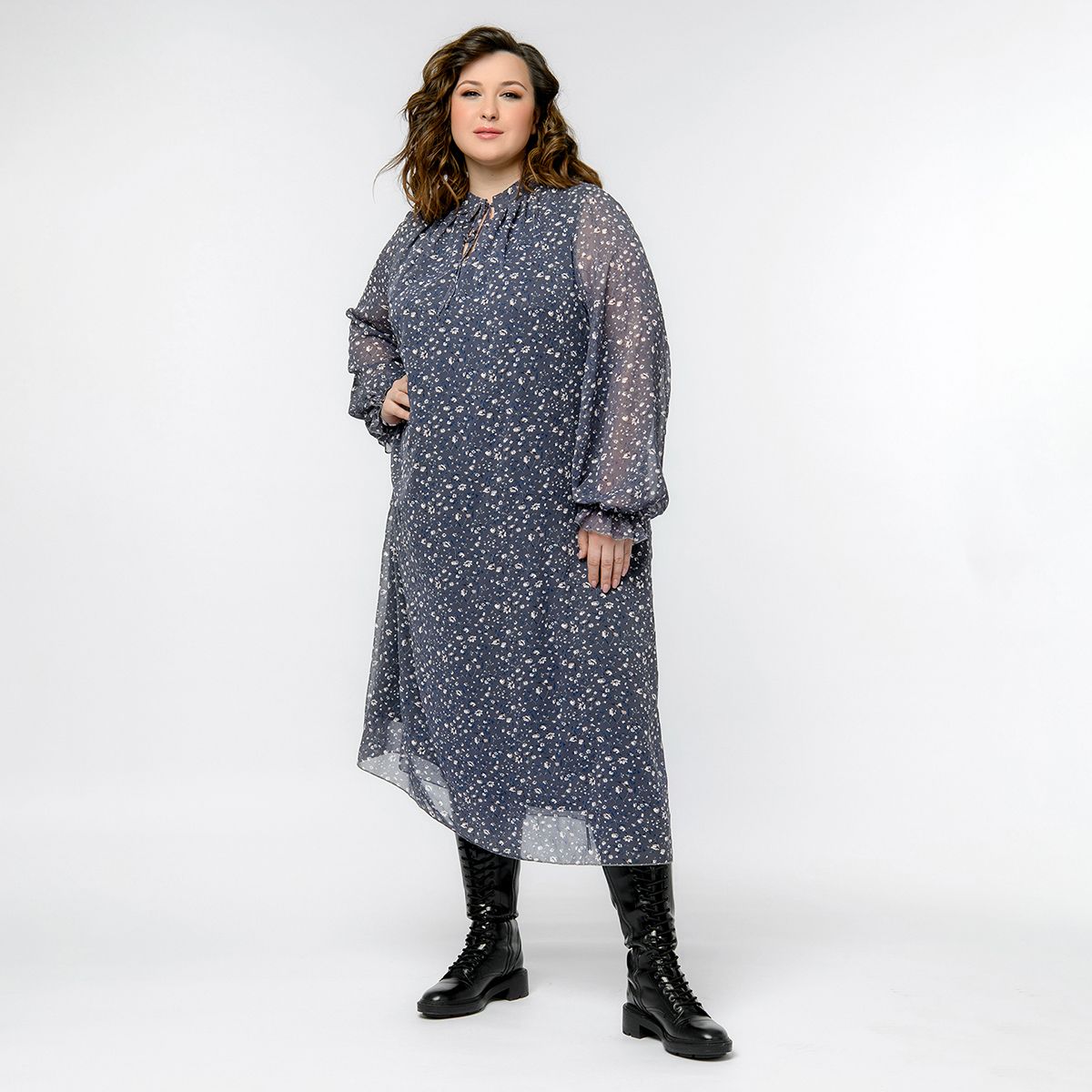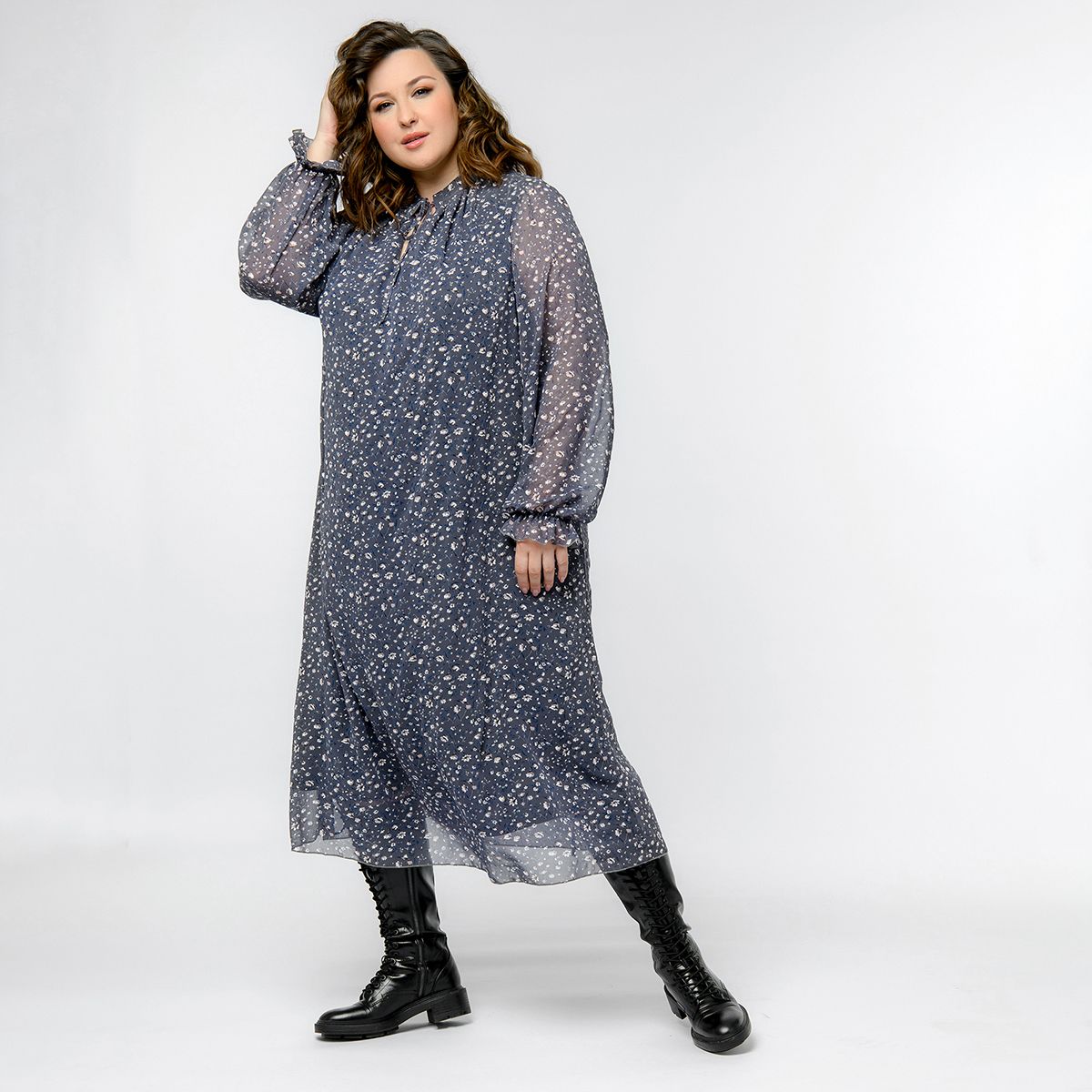 Платье А-силуэта, миди, шифон антрацитовый в мелкий цветочек