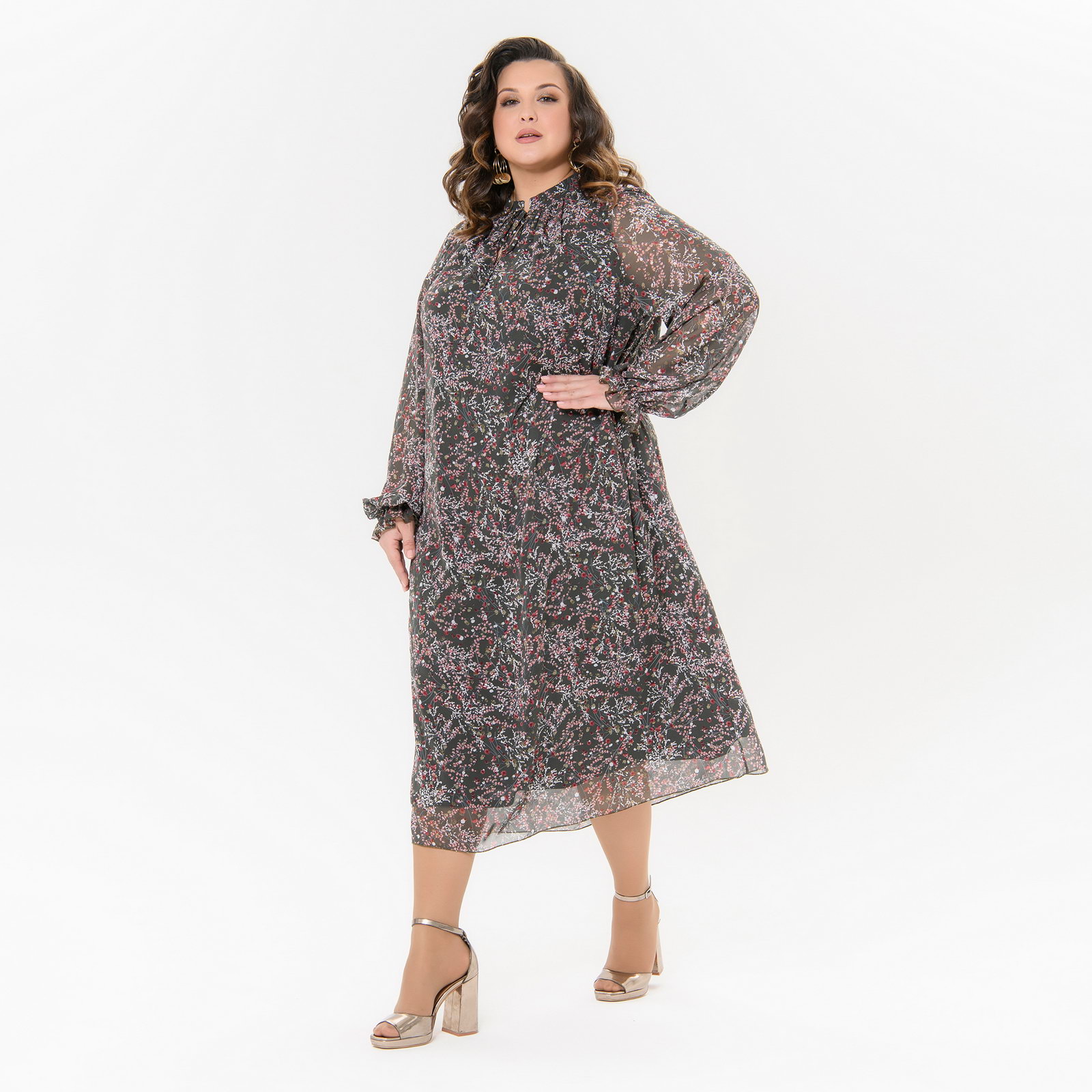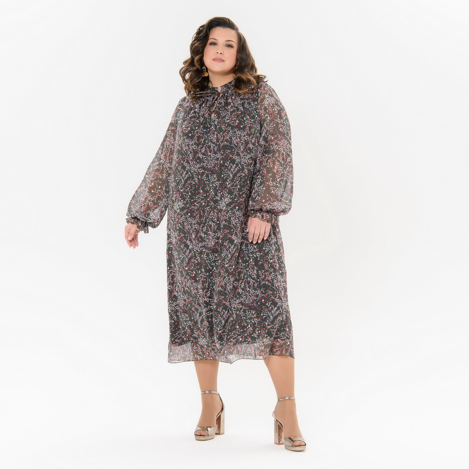 Платье А-силуэта, миди, шифон травяной, принт цветочный