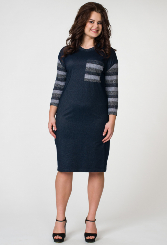 Платье в стиле casual  из трикотажного джинса с отделкой из полосатого трикотажа с люрексом  . Полуприлегающий силуэт . Длинный рукав на удлиненном плече . Накладной карман на уровне груди . Круглый вырез горловины с притачной бейкой . Без подкладки .