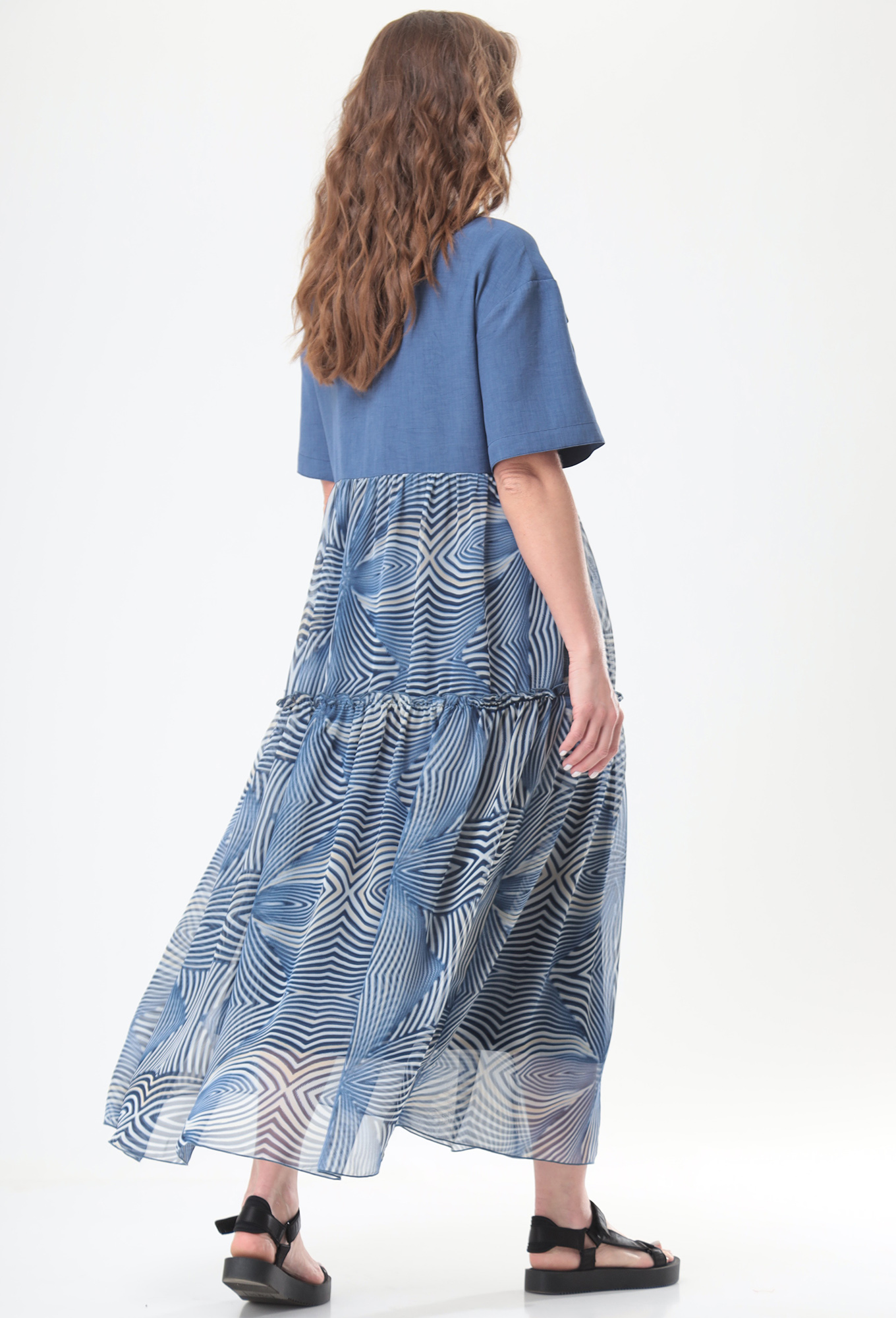 Платье свободного прямого силуэта, длиной макси, выполнено из трех видов тканей, лиф платья выполнен из однотона, юбка из шифона с набивным рисунком, юбка на трикотажной подкладке. Полочка лифа с центральной застежкой по плаке на петли и пуговицы, талиевыми вытачками. В области груди настрочены накладные карманы с клапанами. Воротник рубашечного типа стояче-отложной, на отрезной стойке. Спинка цельная. Пройма углубленной формы. Рукав рубашечного типа, одношовный, длиной до локтя. Верхняя часть юбки платья со сборкой по шву притачивания к лифу, нижняя часть юбки также со сборкой в виде маленькой рюши.