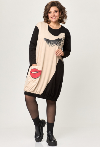Платье длиной до колена. Полочка платья с ассиметричными подрезами и принтом. На левой нижней части полочки настрочен накладной карман. Горловина круглой формы. Пройма углубленной формы, рукав длинный, одношовный. Низ платья обработан притачной планкой с эластичной тесьмой.