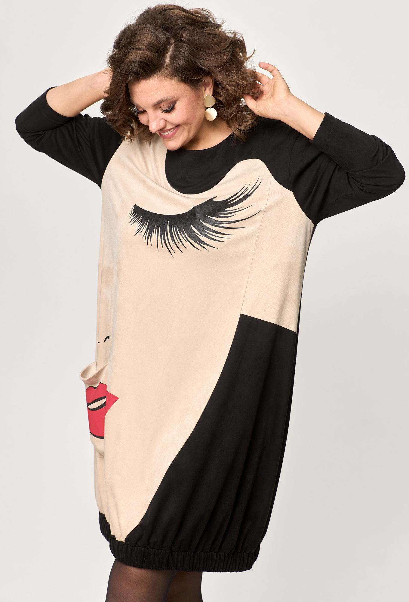 Платье прямого силуэта, выполнено из трикотажного однотонного полотна с эффектом “замша“ в двух контрастных цветах.