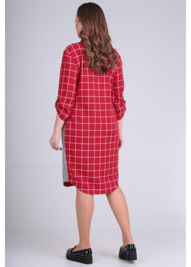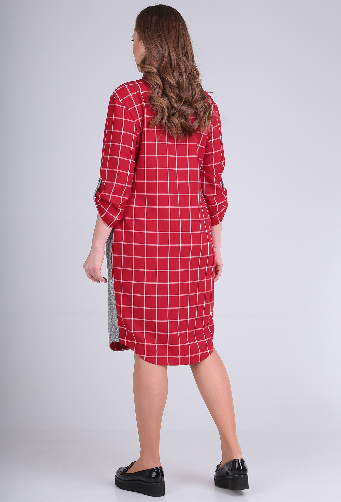 Платье выполнено из комбинации ткани в клетку и меланжевого трикотажного полотна. Платье прямого силуэта, длиной за колено. Полочка платья с центральной застежкой на десять пуговиц и петель, полочка с нагрудными вытачками, правая полочка выполнена из ткани в клетку, левая полочка из трикотажного полотна. На левой полочке в области груди настрочен карман с декором из гипюра в виде цветка. Воротник стояче-отложной, рубашечного типа. Спинка цельная, рукав рубашечного типа, длиной 7/8, втачной, одношовный. В нижней части рукава обработан хлястик, крепящийся пуговицей. Низ платья фигурный, прогнутый по боковым швам.