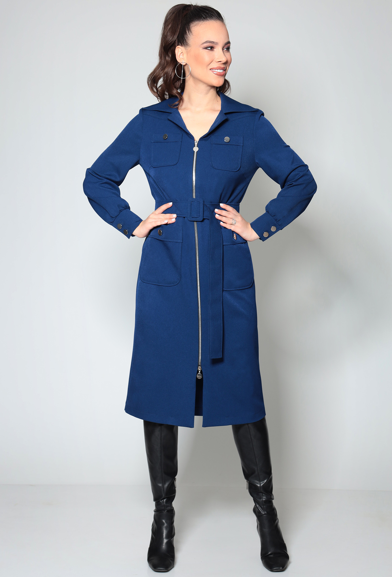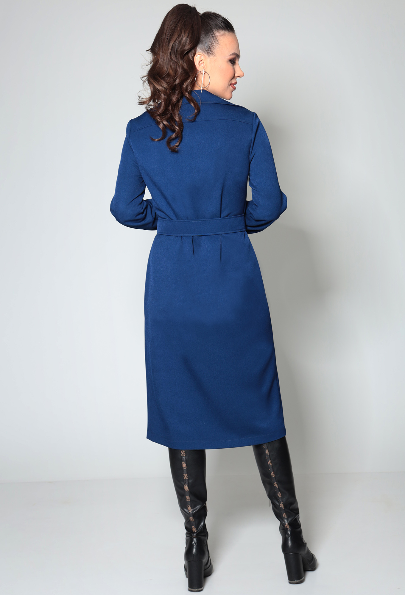 Платье полуприлегающего силуэта, длинной ниже колена, выполнено из ткани костюмно-плательной группы. Перед платья с нагрудными вытачками, накладными карманами и центральной застежкой на молнию. Воротник стояче-отложной, с цельнокроеной стойкой. Рукав длинный, втачной, одношовный по низу со сборкой. Низ рукава обработан притачной манжетой с застежкой на петли и пуговицы. Спинка цельная.