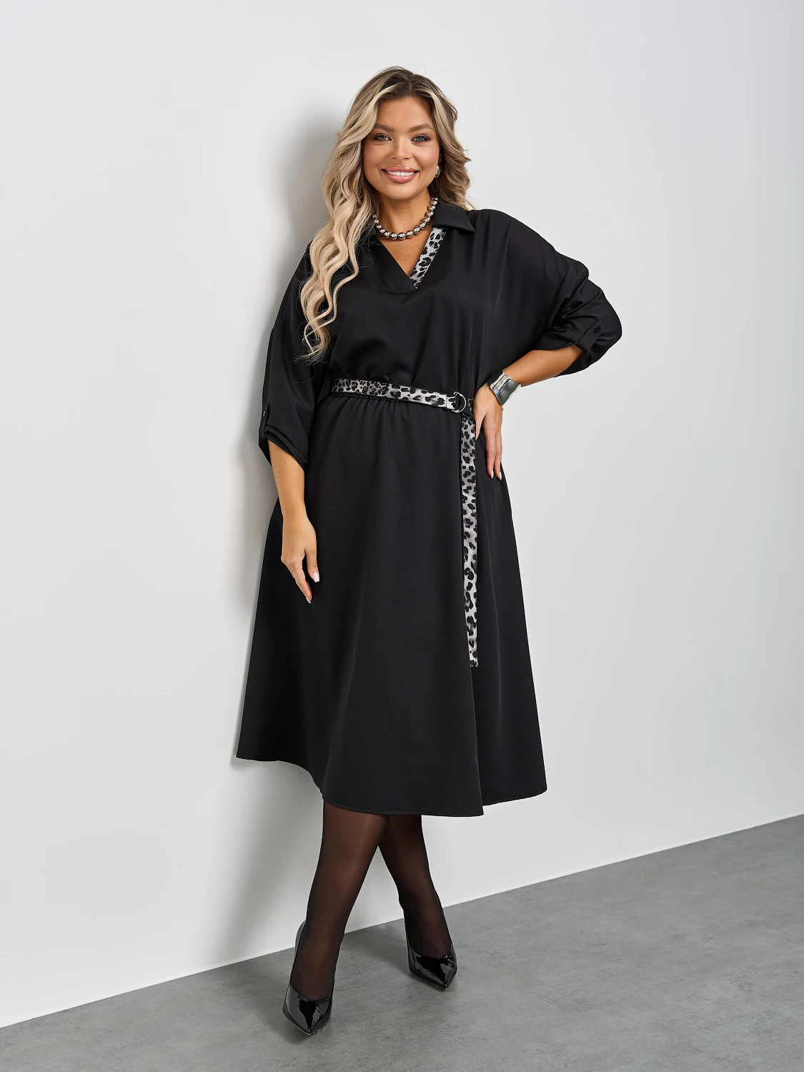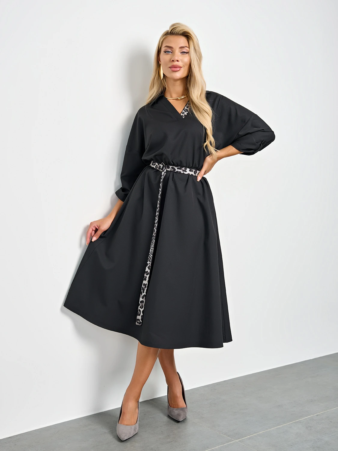 Платье свободного силуэта с удлиненной юбкой.