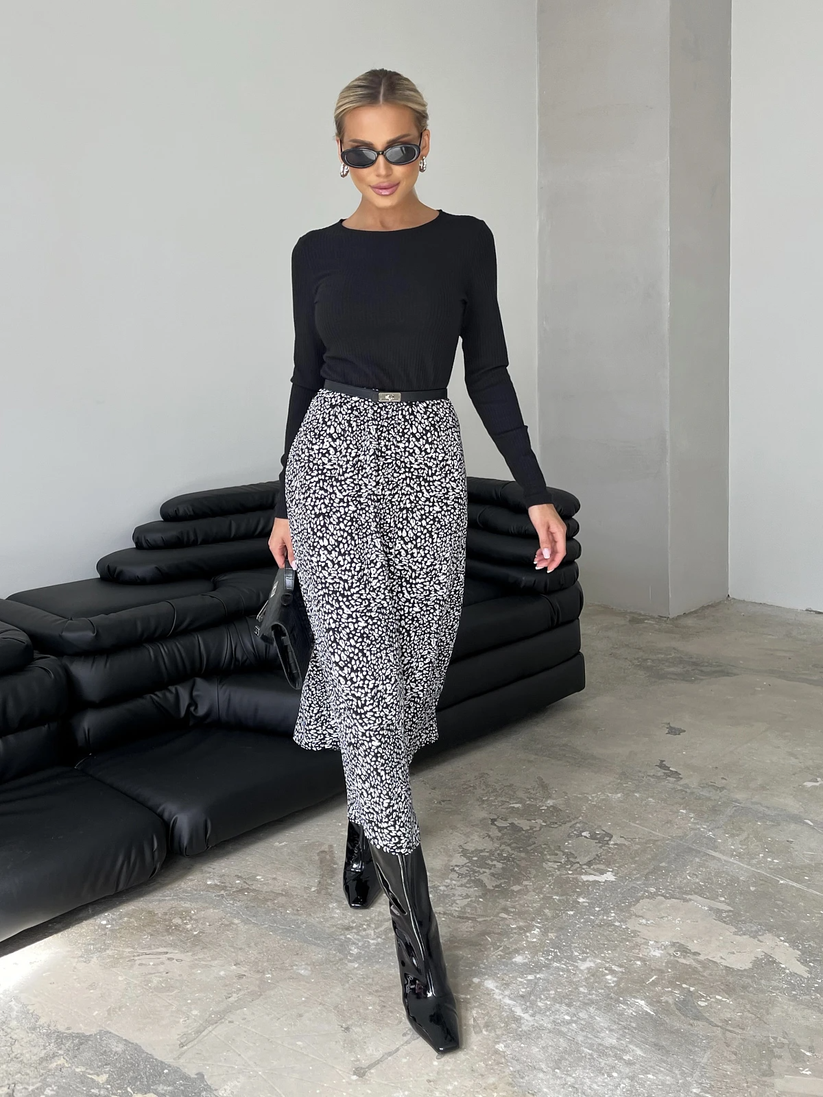 Платье отрезное по линии талии длины миди с длинным рукавом.