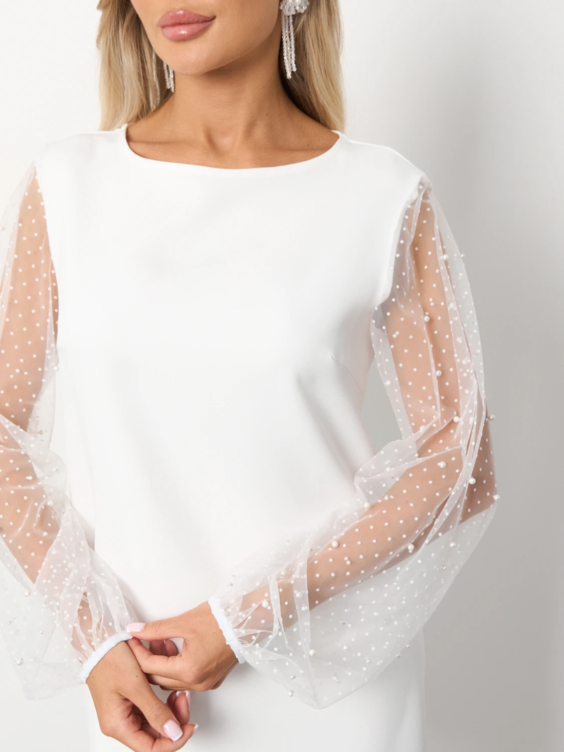 Длинные втачные рукава из сетки в мелкий горошек украшены бусинами.