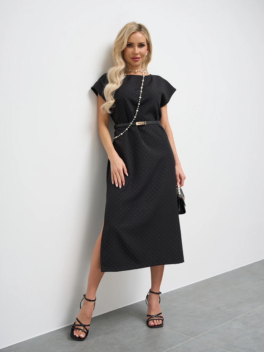 Платье выполнено из костюмной ткани  с серебристым декором, который создает эффект  торжественности и роскоши.