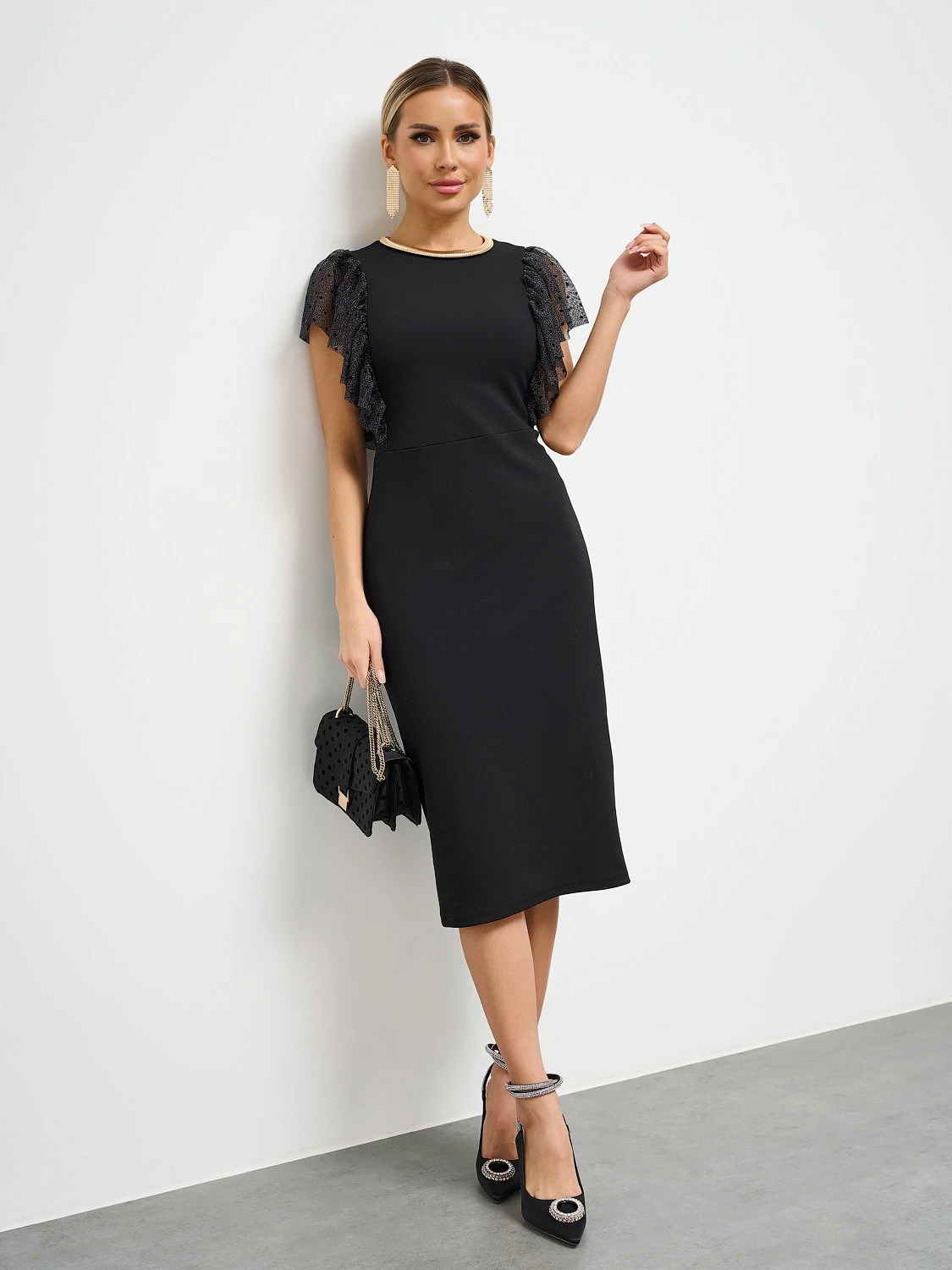 Трикотажное платье прилегающего силуэта длины ниже колена с рукавами воланами из сетки с люрексом.