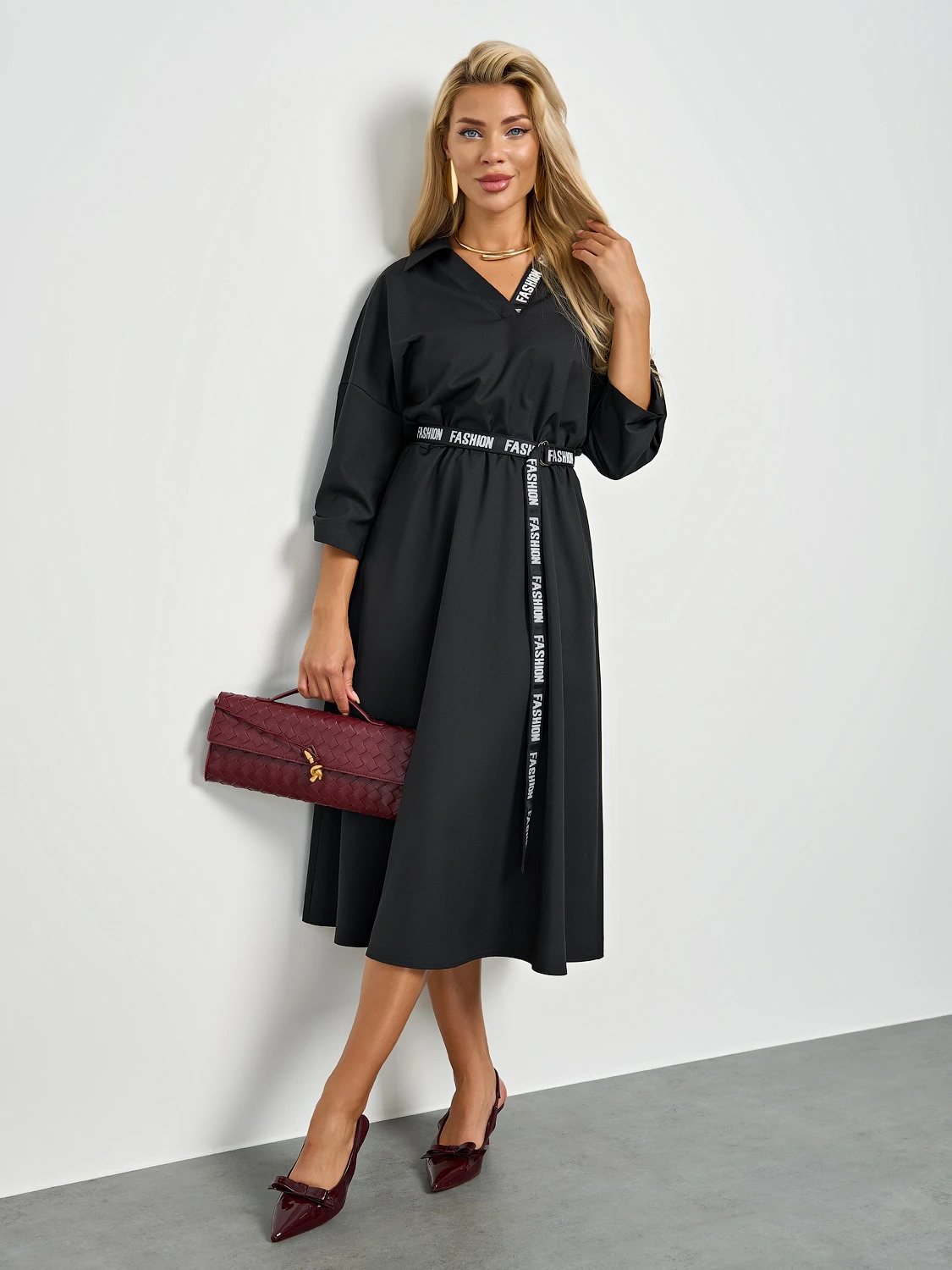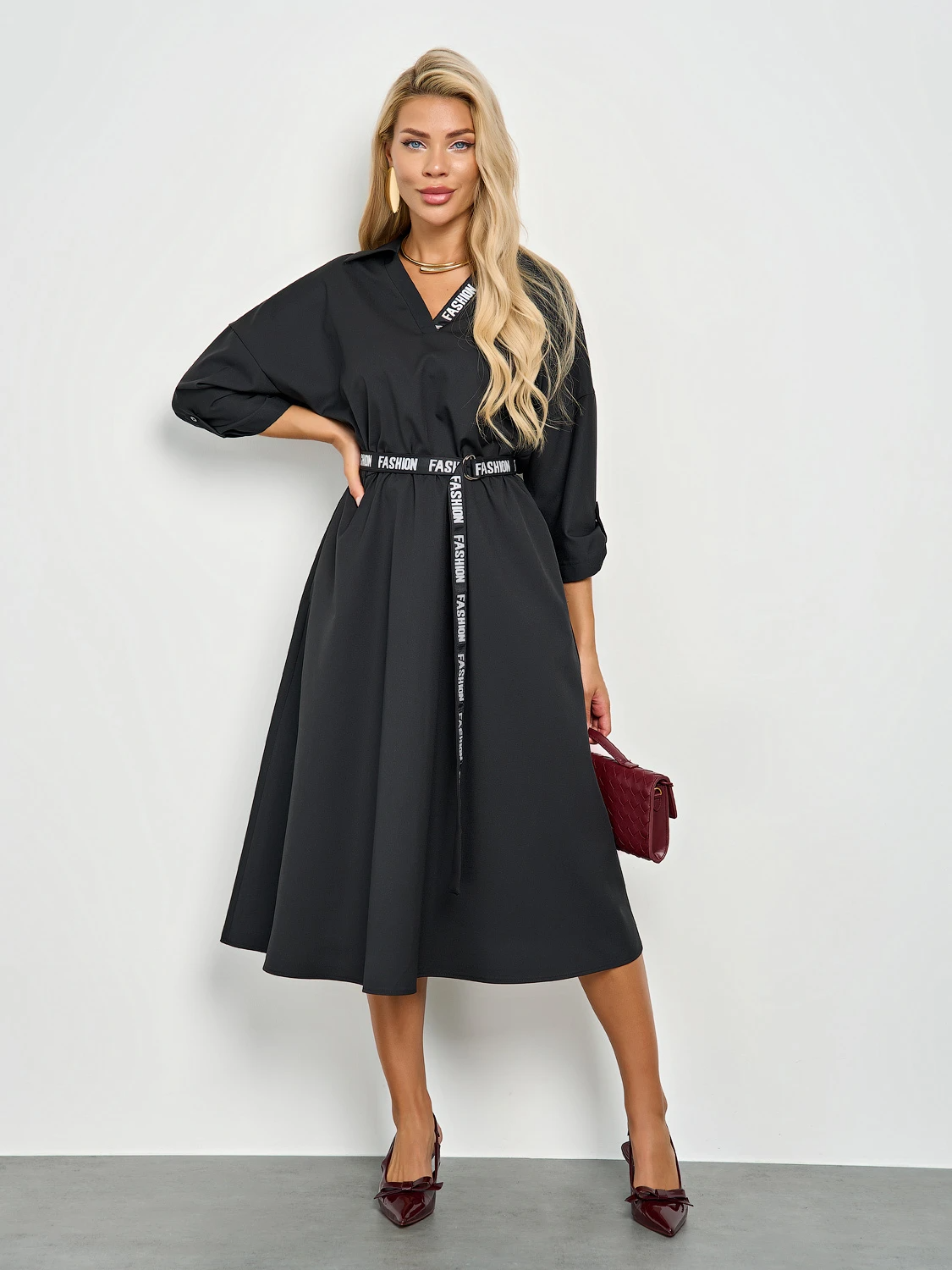 Платье свободного силуэта с удлиненной юбкой.