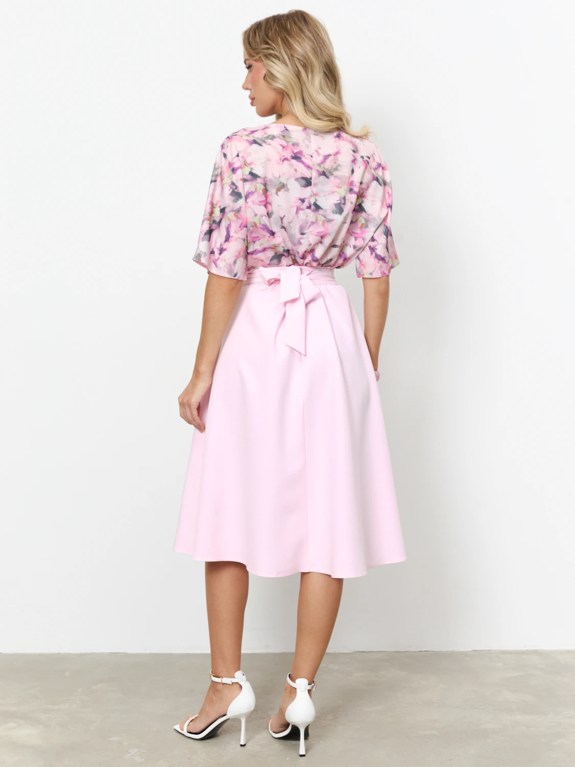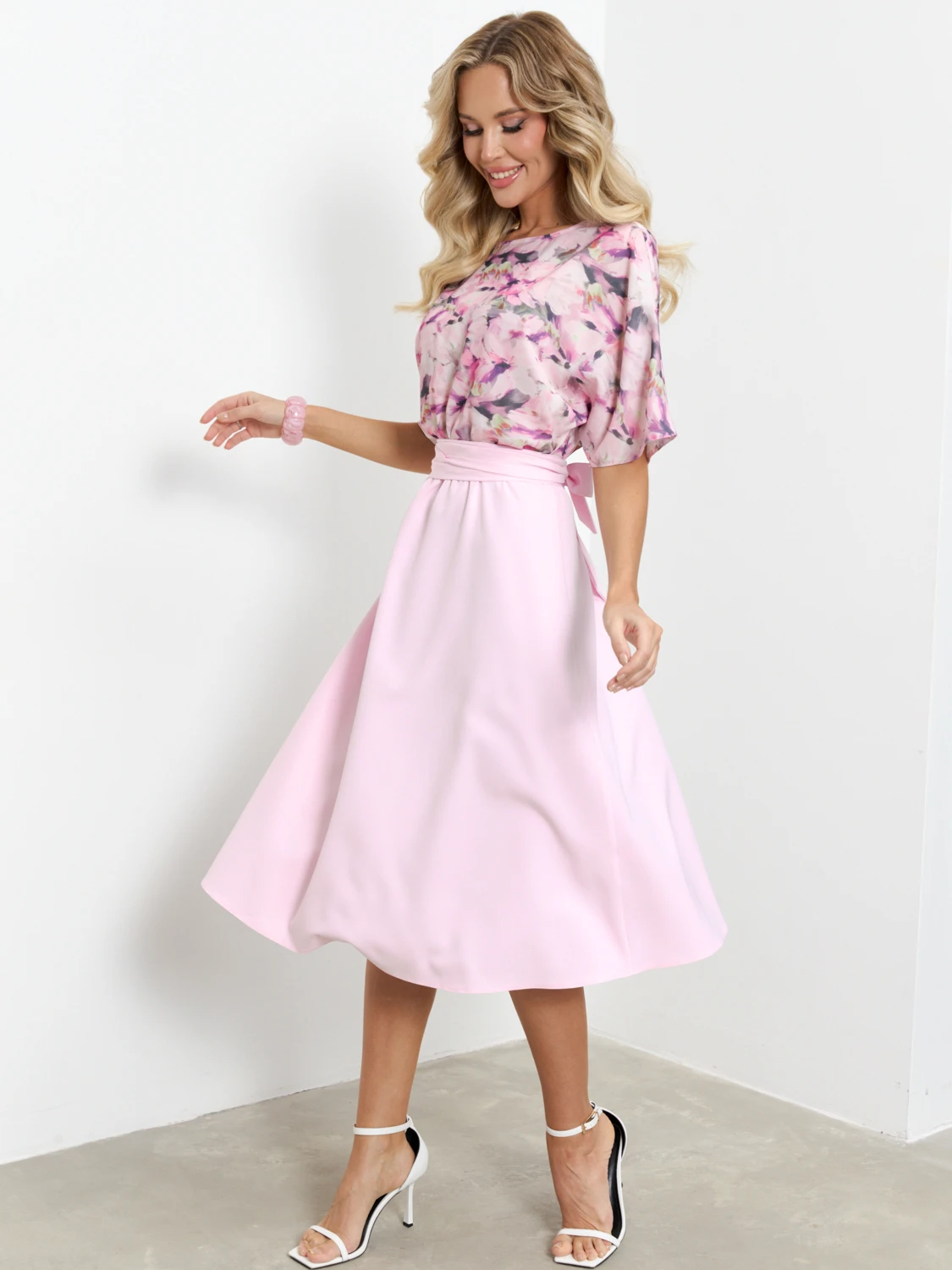 Верх выполнен из плательной ткани с принтом, низ и пояс из однотонной костюмной ткани.