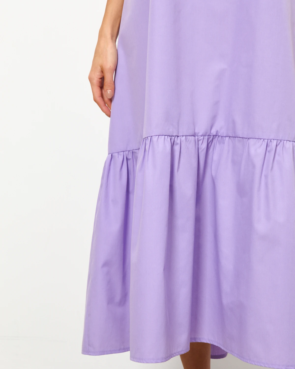 По низу платья пришит ярусный волан.