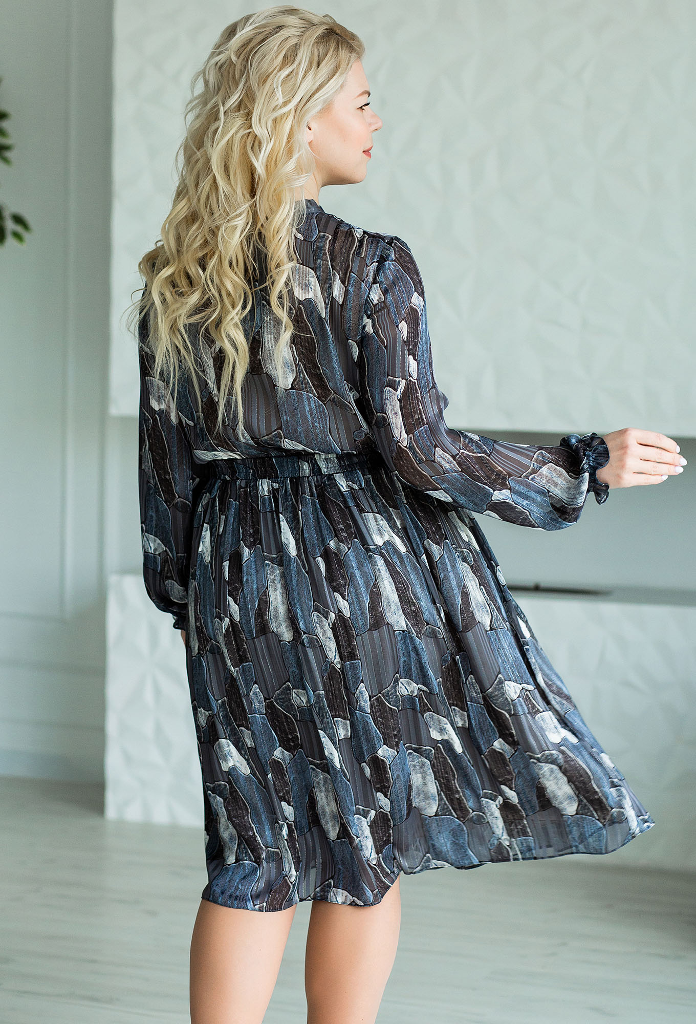 Платье полуприлегающего силуэта с длинным рукавом. Горловина округлая с воротником стойкой переходящей в бант, застежка на петли и