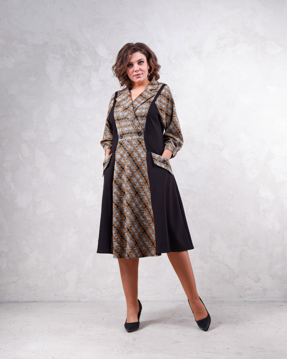 Элегантное платье приталенного Х-образного силуэта, средней длины. Винтажное оформление воротника с лацканами и отложеными клапанами в стиле "Служебный роман". Отделка контрастная с крупными пуговицами. Рукава цельновыкроенные длиной 3/4, на манжете с пуговицей.
