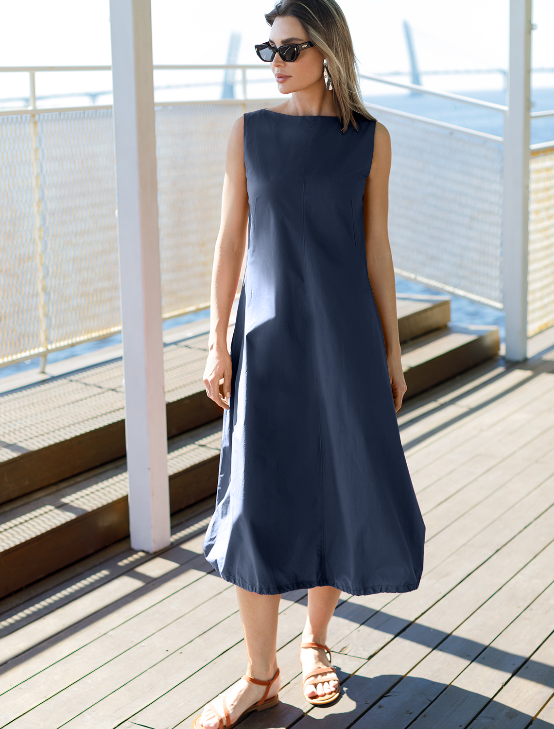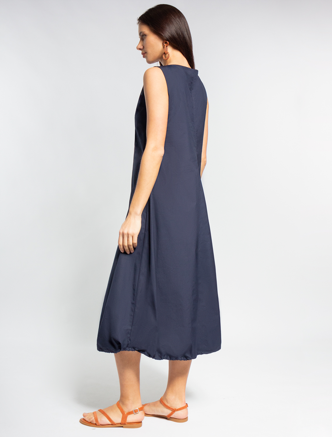 Трендовое платье-баллон выполнено из плотного поплина. Низ изделия сделан на кулиске, что позволяет регулировать форму, используя платье по-разному в зависимости от образа. Материал прочный и износостойкий, но при этом мягкий и удобный, отлично подходит для повседневной носки, гарантируя абсолютный комфорт. темно-синий