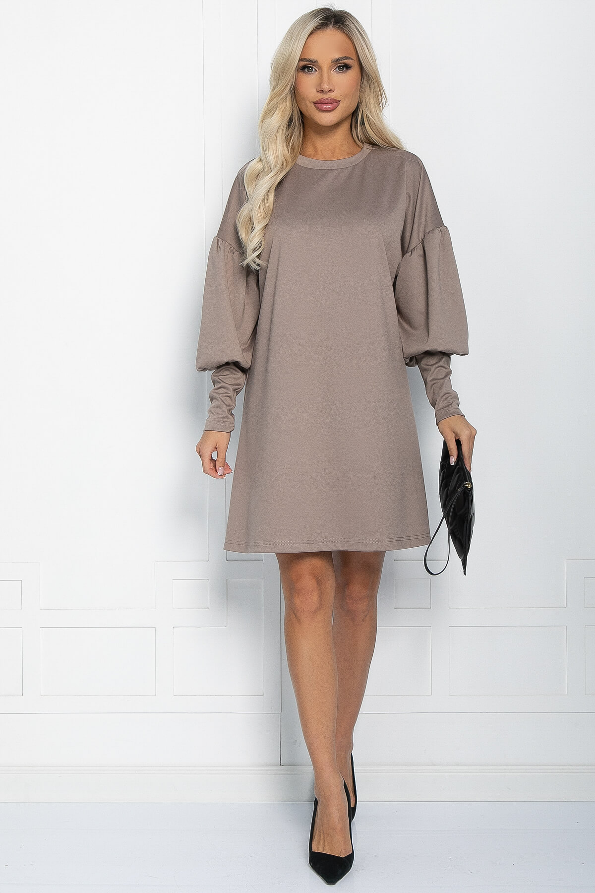 Платье прекрасно подойдёт как для повседневного ношения, так и для работы в офисе. Его округлая горловина придаёт классический вид, а свободный крой не сковывает движений. Объёмные рукава создают ощущение воздушности, а высокие манжеты вносят нотки строгости. Благодаря однотонной расцветке, это платье можно сочетать с самыми разнообразными аксессуарами. Средняя длина идеально сочетается с колготками и сапогами, создавая стильный и элегантный образ.
