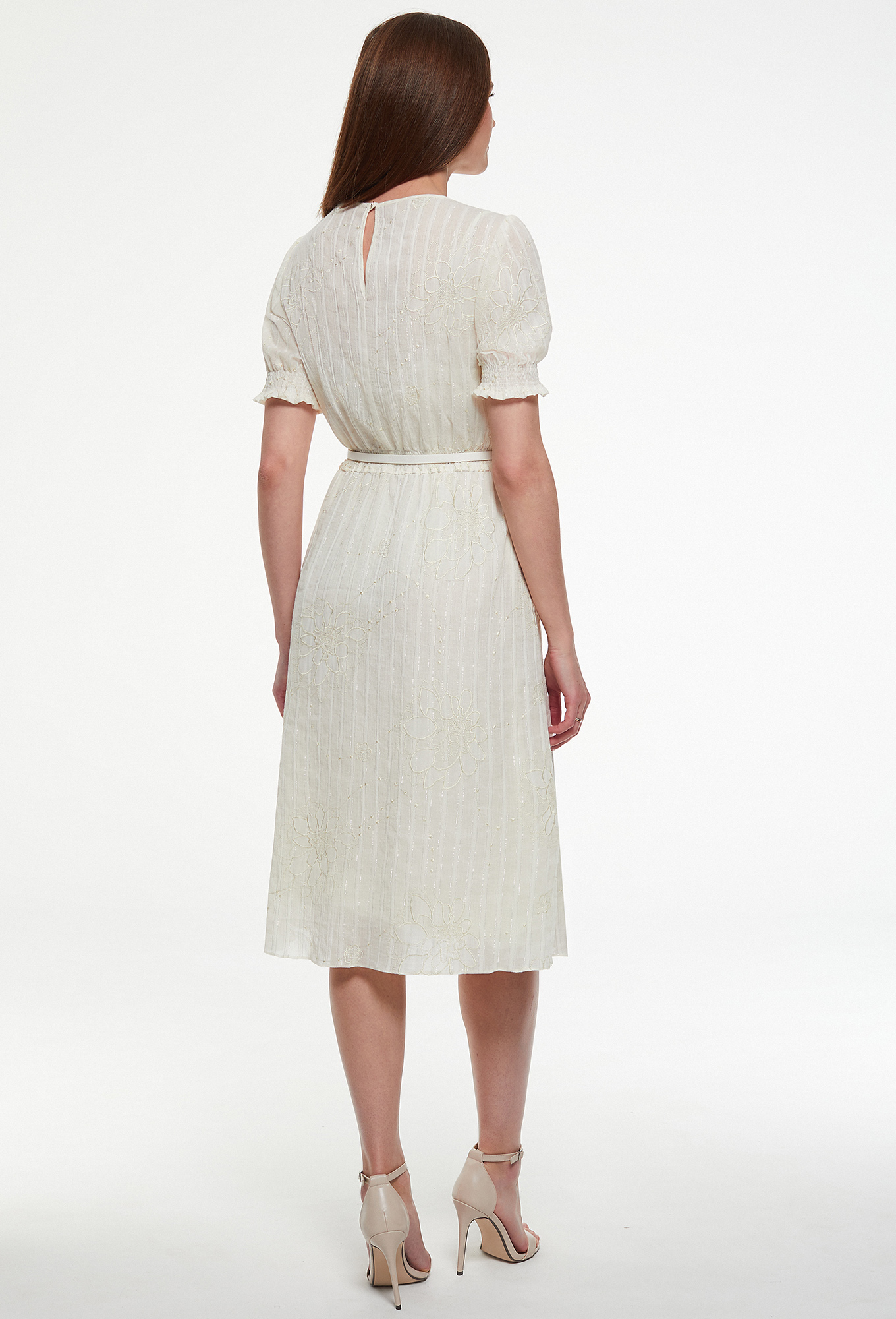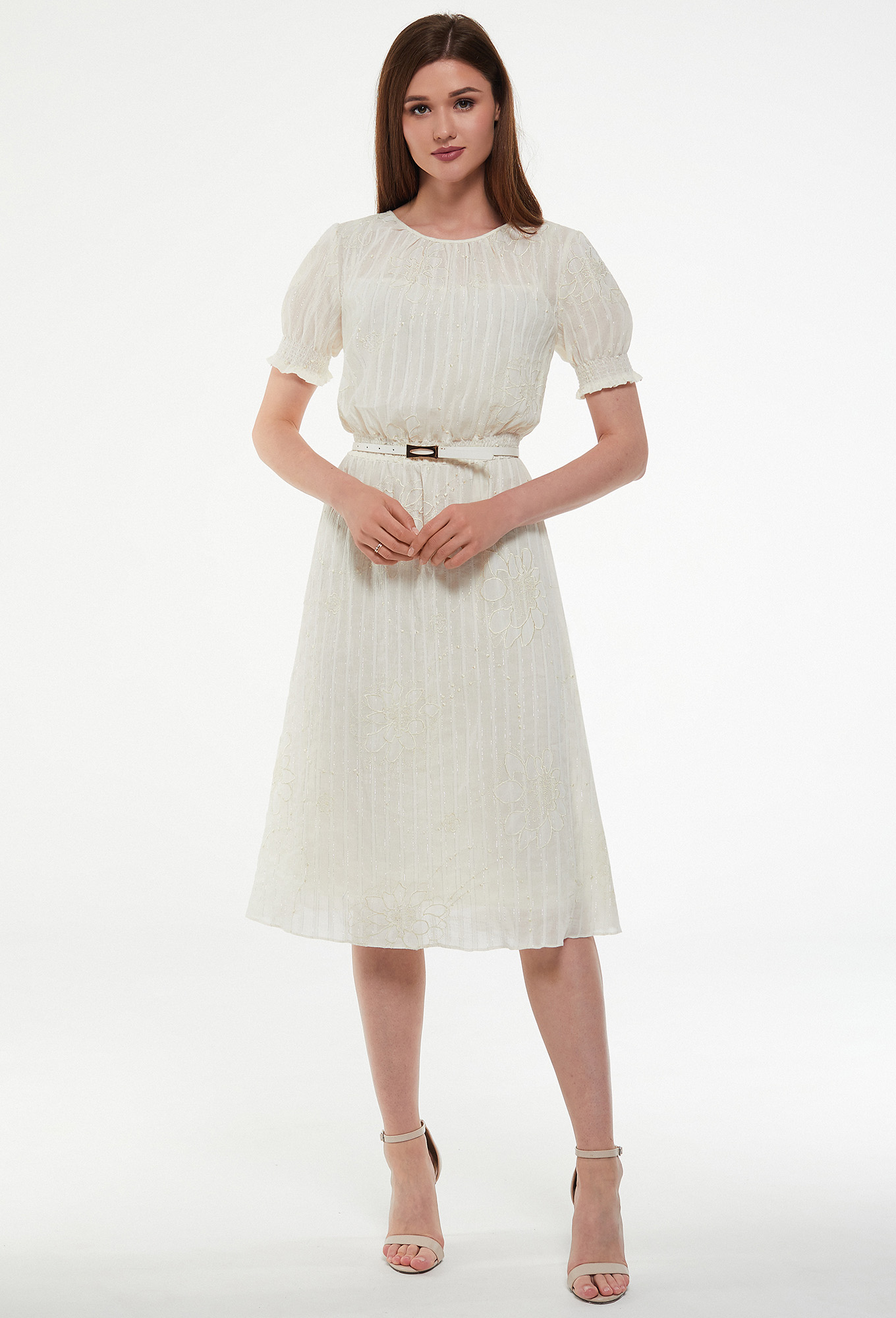 Платье миди свободного кроя с круглым вырезом горловины с небольшой сборкой по переду и застежкой на петлю и пуговицу по спинке. Талия акцентирована сборкой на тонкие резинки, что делает силуэт более женственным. Романтичность платью придает рукав-фонарик. Платье дополнено поясом-ремнем с пряжкой.