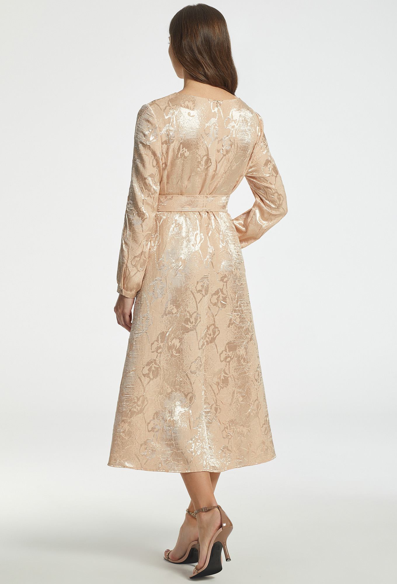 Платье миди А-образного силуэта с круглым вырезом горловины. В среднем шве переда обработана застёжка на одну навесную петлю и пуговицу. В среднем шве спинки обработана потайная молния. Рукава втачные со сборкой по низу и манжетой на одну прорезную петлю и пуговицу. Платье дополняется поясом ремнём из основной ткани с пряжкой.