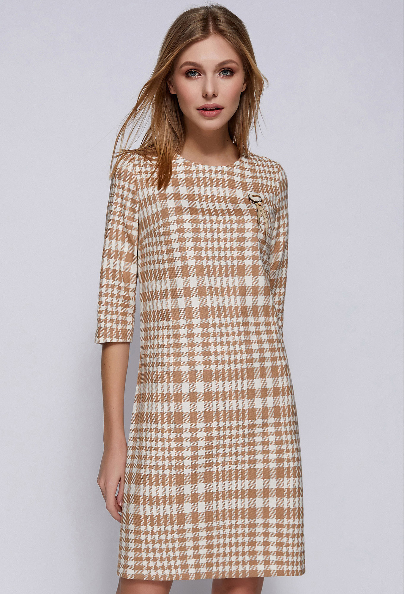 - платье прямого силуэта слегка расширенное к низу с округлым вырезом горловины, выполнена из ткани гусиная лапка