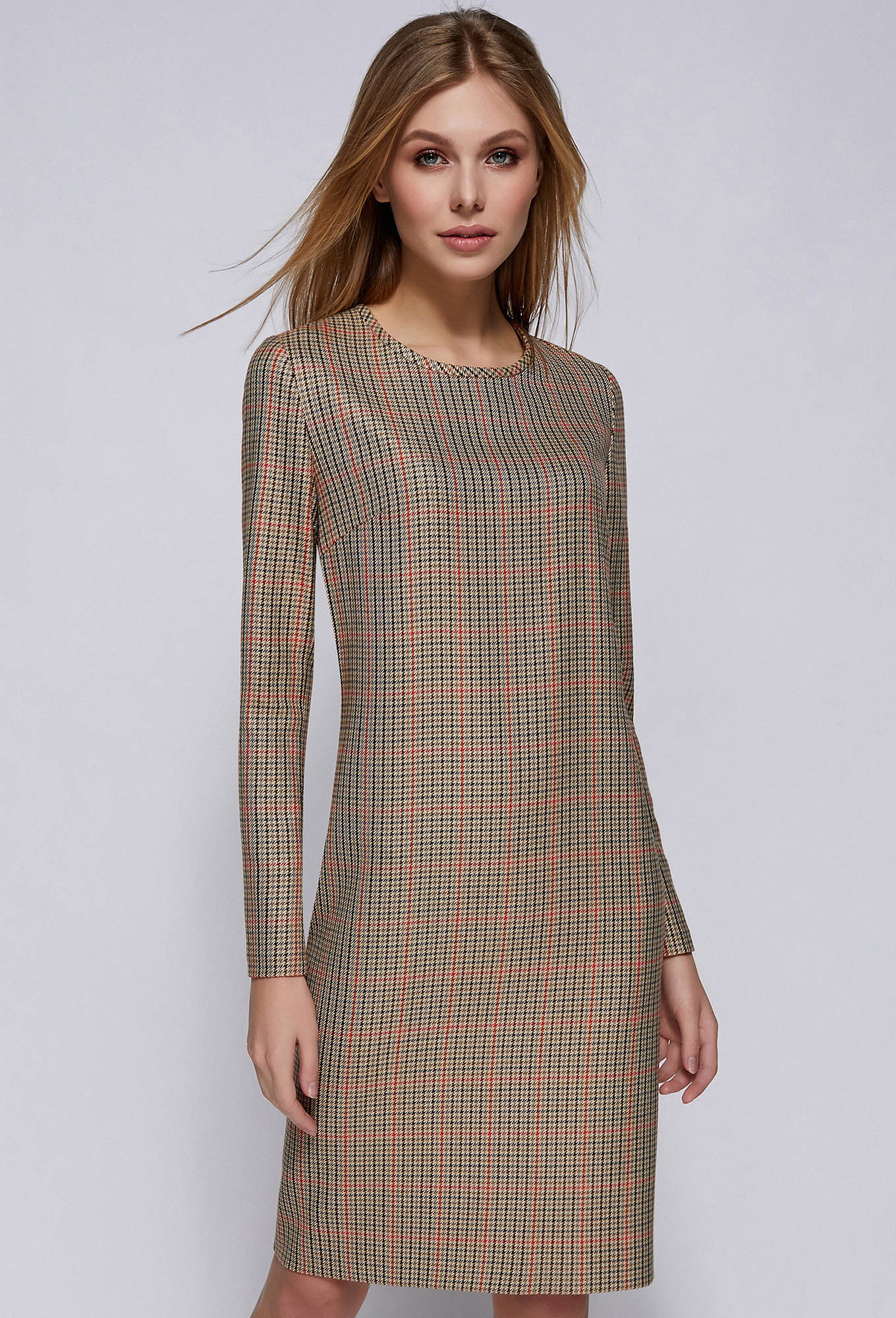- платье прямого силуэта из костюмно-плательной ткани с округлым вырезом горловины
