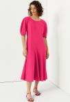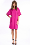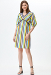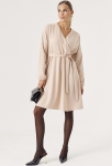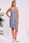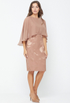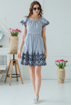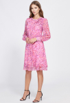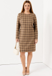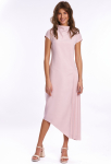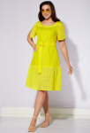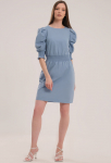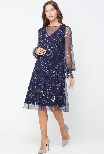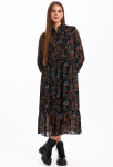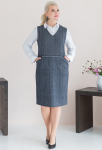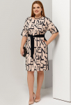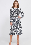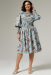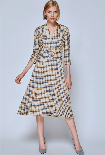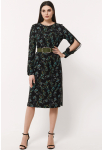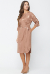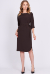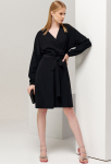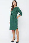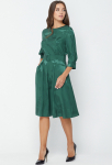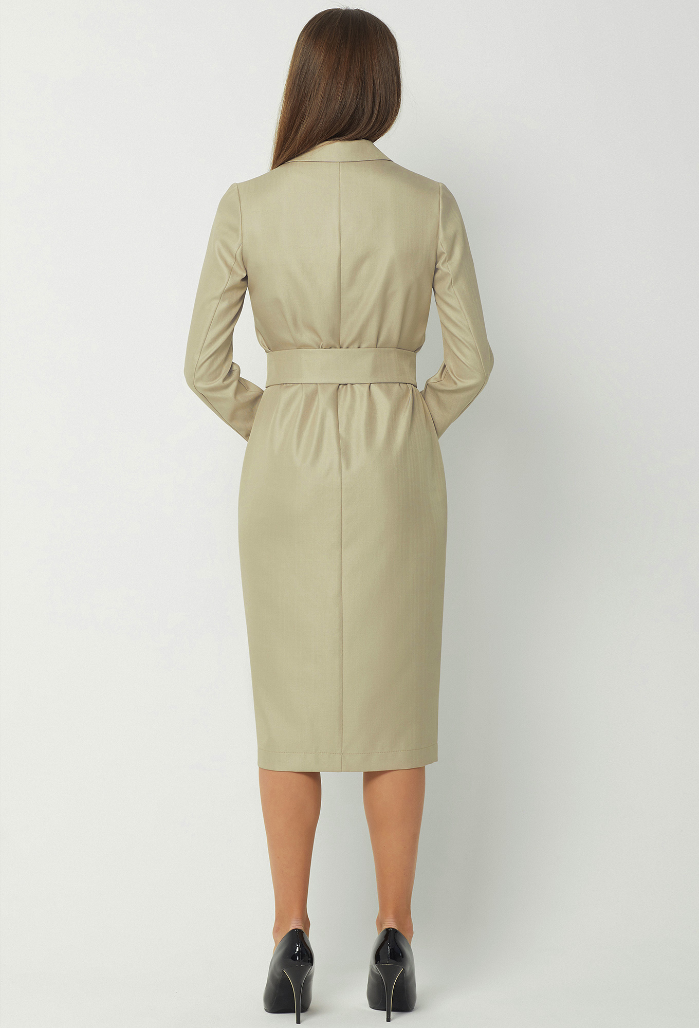 Платье-миди полуприлегающего силуэта из костюмно-плательной ткани, с отложным воротником с лацканами; по переду отрезное по линии талии; верхняя часть с запахом, по нижней части имитация застёжки в два ряда с отделочными пуговицами, в левом боковом шве обработана застёжка на потайную молнию. Спинка со средним швом. Рукава втачные двухшовные - дополняется поясом с пряжкой из основной ткани