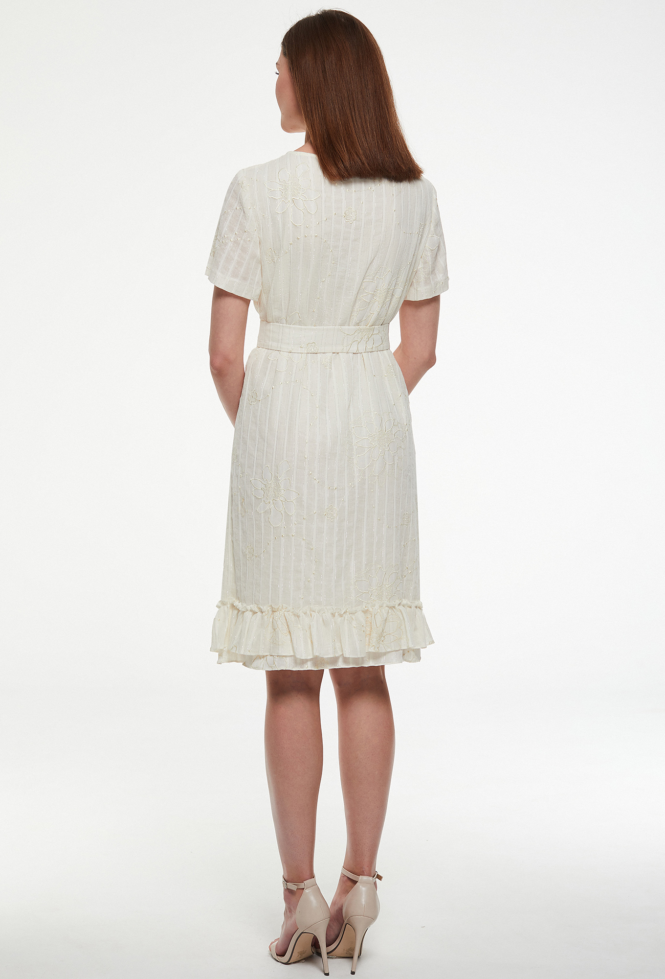 Платье прямого силуэта, слегка расширенное книзу. С округлой формой горловины, по переду со складками, низ платья с оборкой. Рукава втачные одношовные, линия талии подчёркнута поясом из основной ткани с пряжкой.